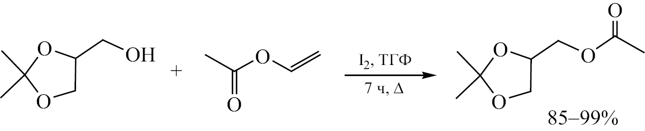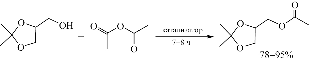 Омылением (2,2-диметил-1,3-диоксан-4-ил)метилацетата в присутствии оловоорганического реагента (схема 5) получают 2,2-диметил-4-оксиметил-1,3-диоксолан с выходом 97% [50]. В качестве растворителя используется метанол. Реакция протекает в течение 6 ч при температуре 30°C.