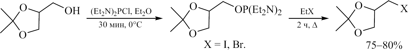 Эффективный метод расщепления тритилового эфира под действием монобромида иода предложен в работах [57, 58] (схема 9). В качестве катализатора используется интергалид IBr в среде хлористого метилена, реакция протекает за 15 мин при комнатной температуре с образованием 2,2-диметил-4-оксиметил-1,3-диоксолана выходом 94%.