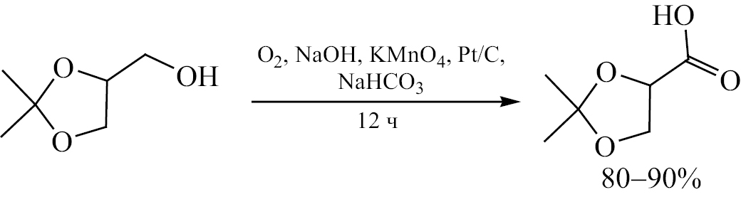 При восстановлении 2,2-диметил-1,3-диоксолан-4-карбоксилата гидридами металлов [46, 53–56] также получают 2,2-диметил-4-оксиметил-1,3-диоксолан (схема 8). Лучшие результаты достигаются при 0°C за 4 ч в среде диэтилового эфира, выход составляет 70–95%.