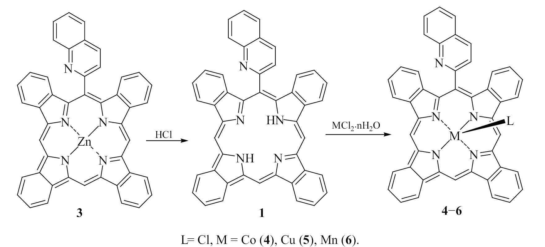 Обработкой комплекса 3 соляной кислотой в хлороформе получен 5-(2-хинолил)тетрабензопорфирин 1. Его взаимодействием с хлоридами кобальта(II), меди(II) и марганца(II) в ДМФА синтезированы соответствующие металлокомплексы 4–6 в соответствии со схемой 3.