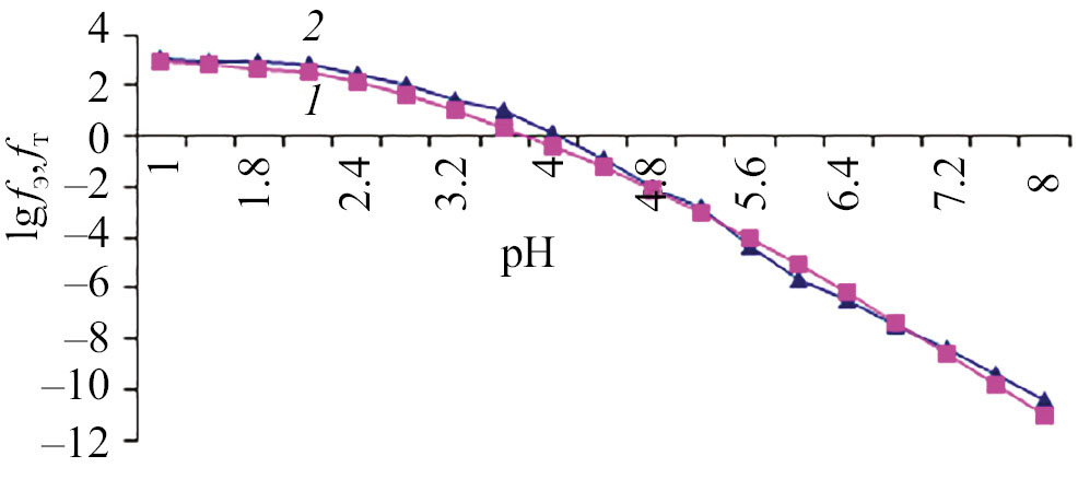 Рис. 4. Зависимости логарифмических значений экспериментальной fэ (1) и теоретической fт (2) окислительной функций от рН для системы Fe(0)–Fe(II)–L-Ala–Na(H)ClO4–H2O при 298.15 K, ионной силе раствора Na(H)CIO4 I = 0.10 (cFe(II) = 1·10–3 и cL = 1·10–2 моль/л).