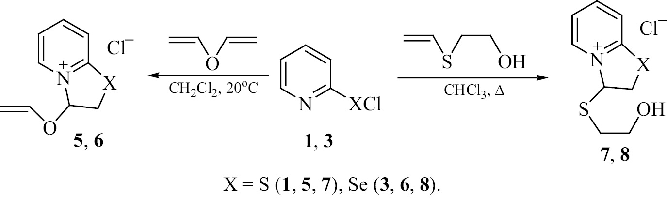 Ранее нами было показано, что реакция пиридин-2-халькогенилбромидов легко протекают с виниловыми эфирами с образованием соответствующих конденсированных продуктов с высокими выходами [24]. В данной работе в реакцию аннелирования с сульфенил- и -селенилхлоридами 1, 3 впервые вовлечен дивиниловый эфир (схема 2). Установлено, что реакция с дивиниловым эфиром селективно протекает при комнатной температуре в хлористом метилене с образованием 3-винилоксипроизводных 5 и 6 с выходами 90 и 86% соответственно (схема 2).