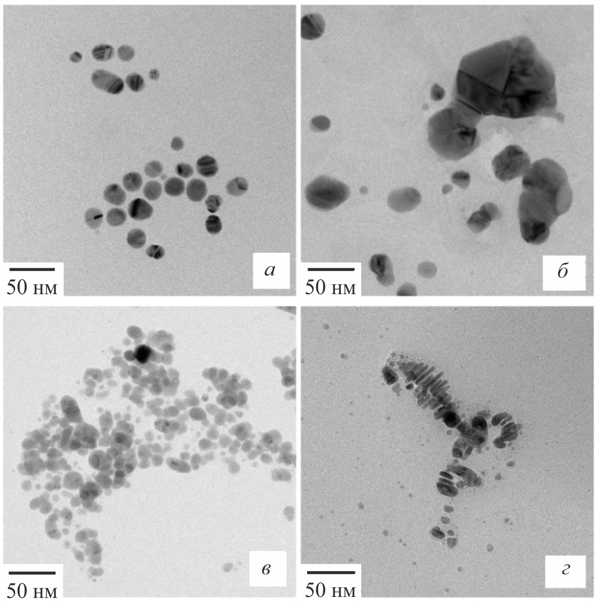 Можно отметить монодисперсность и практически правильную сферическую форму цитратных (рис. 2, а) и циклодекстриновых наночастиц (рис. 2. в); значительный разброс по размерам для электроискровых частиц (рис. 2, б), что подтверждает форму спектра поглощения; наличие частиц плоской треугольной формы, собранных в стопки, с небольшой примесью сферических частиц (рис. 2, г).
