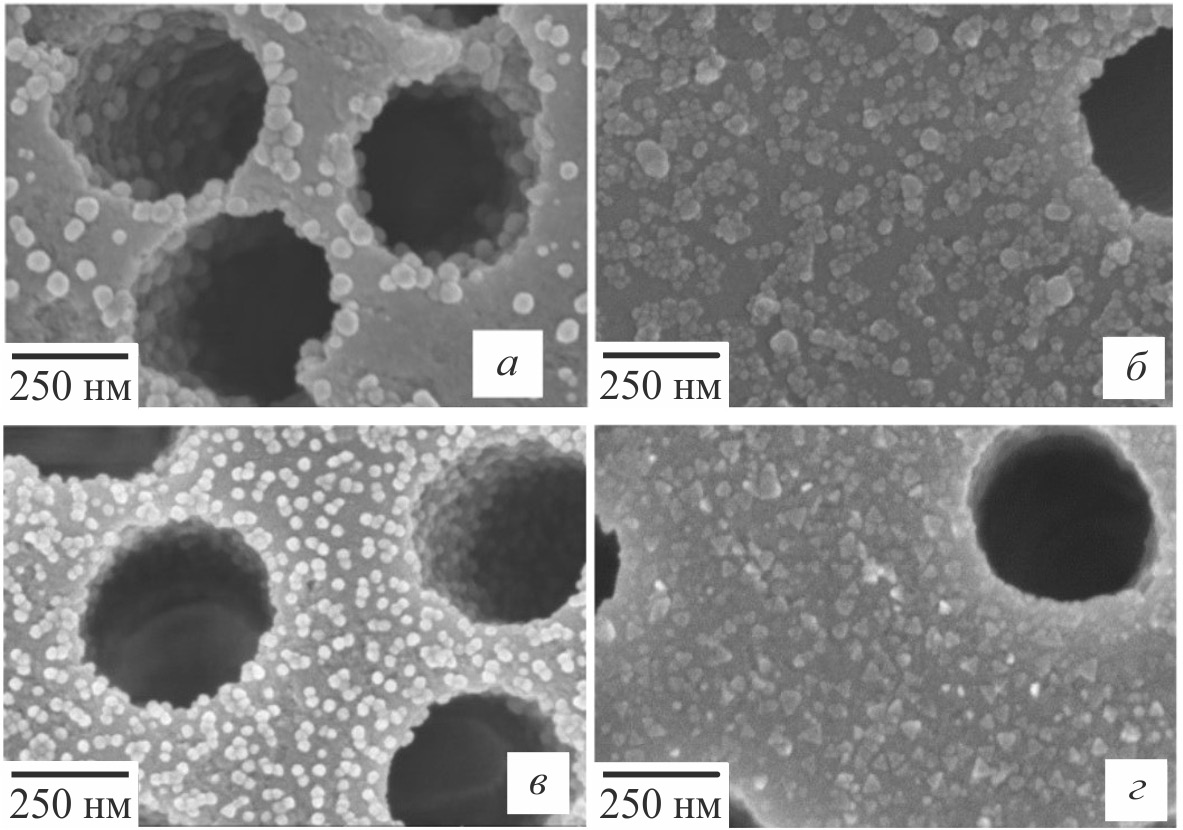 На поверхности всех образцов трековых мембран можно отметить достаточно плотное заполнение наночастицами (рис. 3). Циклодекстриновые наночастицы серебра имеют наиболее равномерное распределение по фронтальной поверхности мембраны (рис. 3, в).