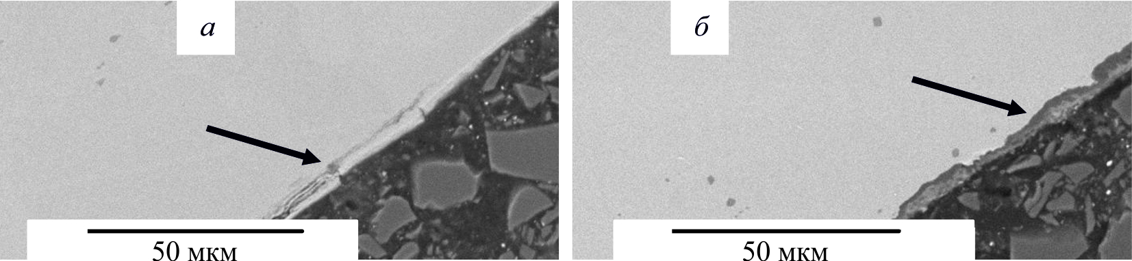 При обогащении окислителя кислородом деградация фехралевой проволоки в центре матрицы протекает с большей скоростью в сравнении с не обогащенным кислородом воздухом. В этом случае толщина оксидного слоя значительно больше соответствующей в условиях необогащенной кислородом среды при сопоставимых значениях времени эксперимента. Например, после 14 ч эксплуатации в обогащенной кислородом воздушной среде толщина оксидного слоя составляет 4–6 мкм (рис. 7, б; 8), в то время как в образце после эксплуатации в необогащенном кислородом воздухе методом растровой электронной микроскопии оксидный слой обнаружить не удалось, т. е. его толщина меньше 1 мкм.