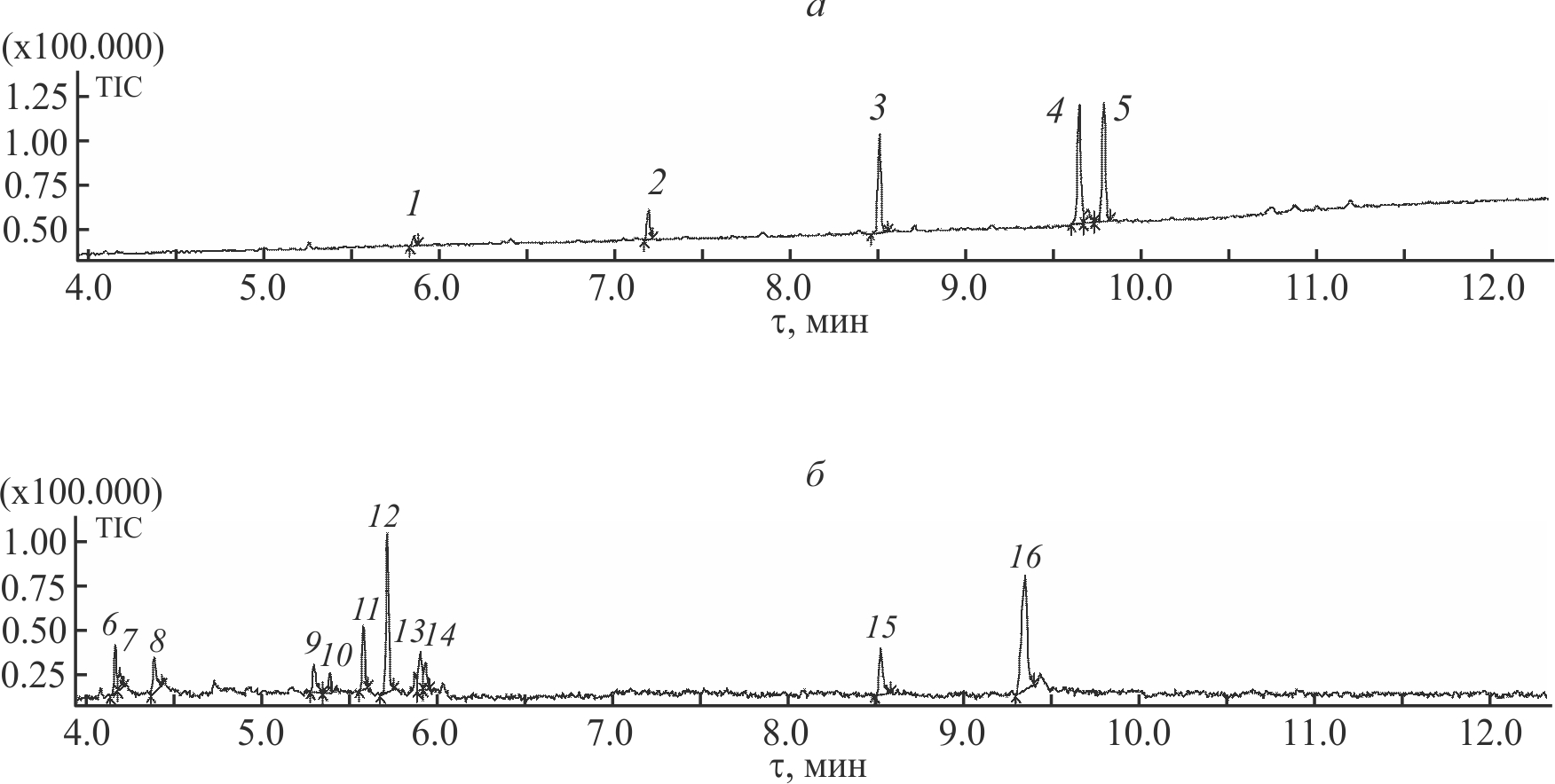 В результате использования ресурсосберегающих технологий [8] винтеризации растительного масла, предполагающих рециклинг отработанных диатомитовых фильтровальных порошков, получают порошок O-2. Рециклинг выгоден с точки зрения экономии расхода дорогостоящего кизельгура и извлечения в процессе регенерации воскосодержащего продукта для использования в качестве полезного возобновляемого вторичного ресурса. При исследовании экстракта сложной смеси компонентов органических веществ O-2 рассмотрены 11 наиболее интенсивных пиков на хроматограмме (рис. 1, б): пики 6–14 соответствуют одорирующим веществам в растительном масле. Пики 15, 16 характеризуются высоким временем удерживания 8.5 и 9.3 мин соответственно, порошок O-2 содержит вещества, молекулярные ионы которых соответствуют метиловым эфирам высших жирных кислот (m/z 256, m/z 264).