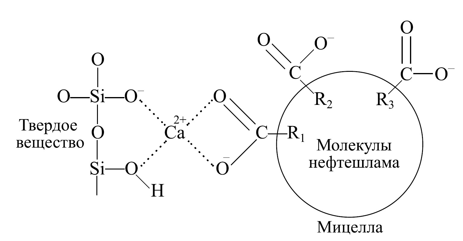 Для упрощения химического способа обезвреживания нефтешлама ранее предложен способ, по которому O-2 проявляет двойственную активность в обезвреживающей композиции — и реагента, и модификатора в составе трехкомпонентной обезвреживающей композиции, состоящей из СаО, O-2 и ОДМ-2Ф, с получением продуктов утилизации [5]. Отработанный диатомитовый порошок O-2 содержит в своем составе органическую и минеральную части, т. е. обладает двойственными свойствами и модификатора-гидрофобизатора, и кремнеземсодержащего сорбента. Наличие в составе модификатора сложных эфиров, спиртов, углеводородов, состоящих из гидрофобного «хвоста» (углеводородные цепи), способствует проявлению гидрофобизирующих свойств. Моно- и диацилглицерины при взаимодействии с гидроксидом кальция, гидролизуясь в щелочной среде, образуют кальциевые соли карбоновых кислот. Соли карбоновых кислот формируют мицеллы, в которых внутренняя область состоит из гидрофобных углеводородных цепей — неполярная фаза, в которой и растворяются неполярные молекулы нефтешлама. Поверхностный слой мицеллы составляют карбоксилат-анионы, по-видимому, именно карбоксилатные группы через катионы кальция «закрепляют» мицеллы на поверхности диатомитового порошка (рис. 5).