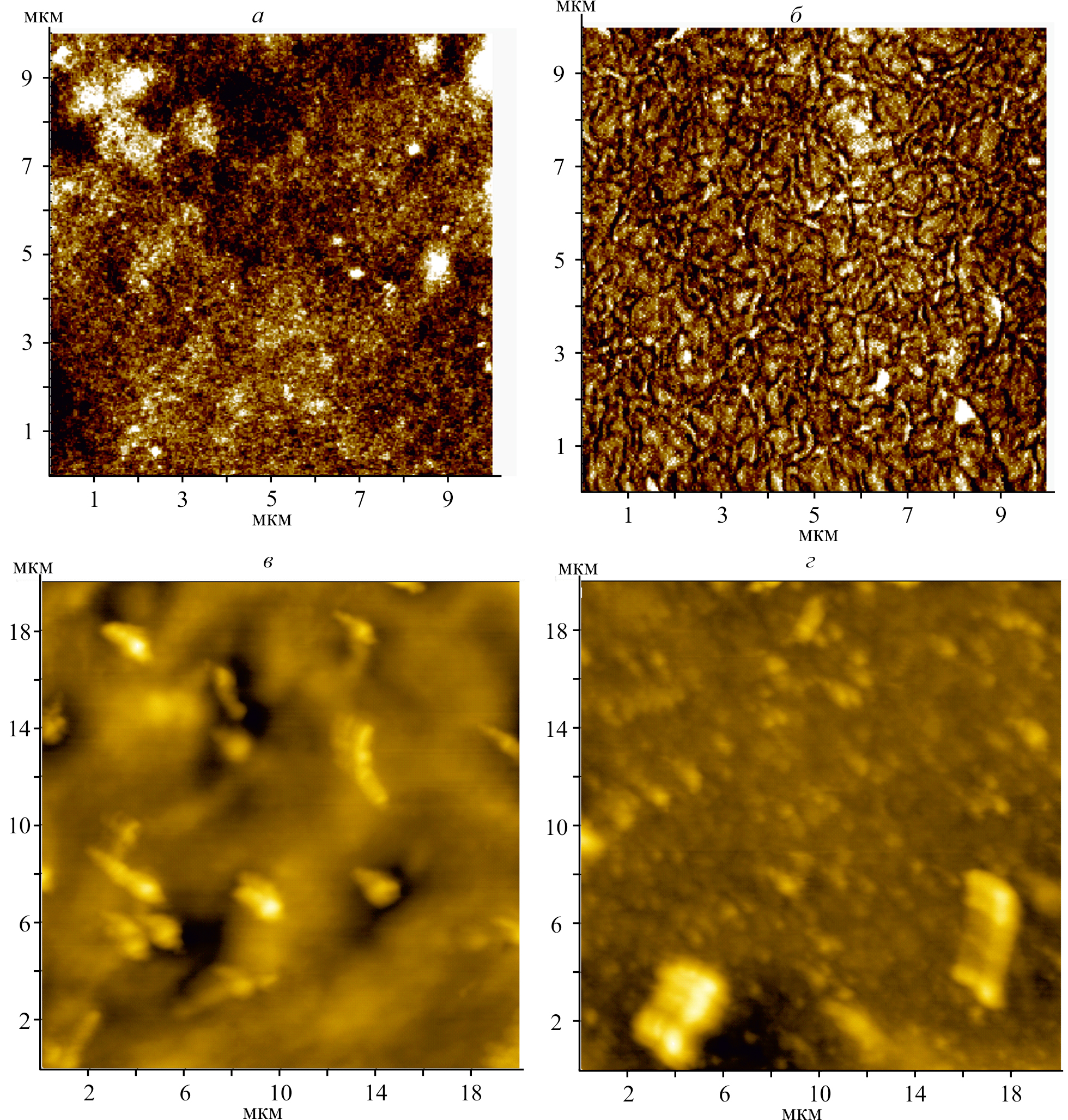 Поскольку процесс детектирования в сенсорных устройствах начинается с адсорбции анализируемого газа на поверхности сенсора, на чувствительность работы устройства будут влиять факторы, способствующие увеличению адсорбции, например, увеличение площади поверхности тонкопленочной структуры за счет более выраженного рельефа поверхности. В случае полимерных пленочных образцов топография и морфология поверхности связаны с различиями в надмолекулярной структуре, обусловленными условиями получения пленок, такими как концентрация полимера в формовочном растворе и наличие структурообразующих добавок [11]. Действительно, изменение концентрации полимера в исходном растворе и наличие наночастиц AgI существенно сказываются на морфологии пленки (рис. 1). Пленки, полученные из растворов натриевой соли N-cукцинилхитозана концентрацией 1% и менее, характеризуются структурой, состоящей из мелких зерен надмолекулярных образований с размером порядка нескольких нанометров. При повышении концентрации натриевой соли N-cукцинилхитозана в растворе до 2% формируются продолговатые зернистые элементы структуры длиной в несколько микрометров. Присутствие наночастиц AgI оказывает влияние на морфологию элементов структуры и топографию поверхности пленок, причем самое значительное влияние наблюдается в случае менее концентрированных 1%-ных исходных растворов натриевой соли N-cукцинилхитозана. Данный факт можно связать с тем, что на частицах AgI происходит адсорбция макромолекул полимера, следовательно, наночастицы служат дополнительными узлами сетки зацеплений макромолекул, что приводит к изменению степени структурированности системы. В случае больших концентраций полимера число межмолекулярных контактов растет, и вклад наночастиц иодида серебра в структурообразование растворов не столь значителен. Максимально выраженным рельефом поверхности характеризуются пленочные образцы на основе полимер-коллоидных дисперсий натрийкарбоксиметилцеллюлоза–AgI и хитозан–AgI (табл. 1).