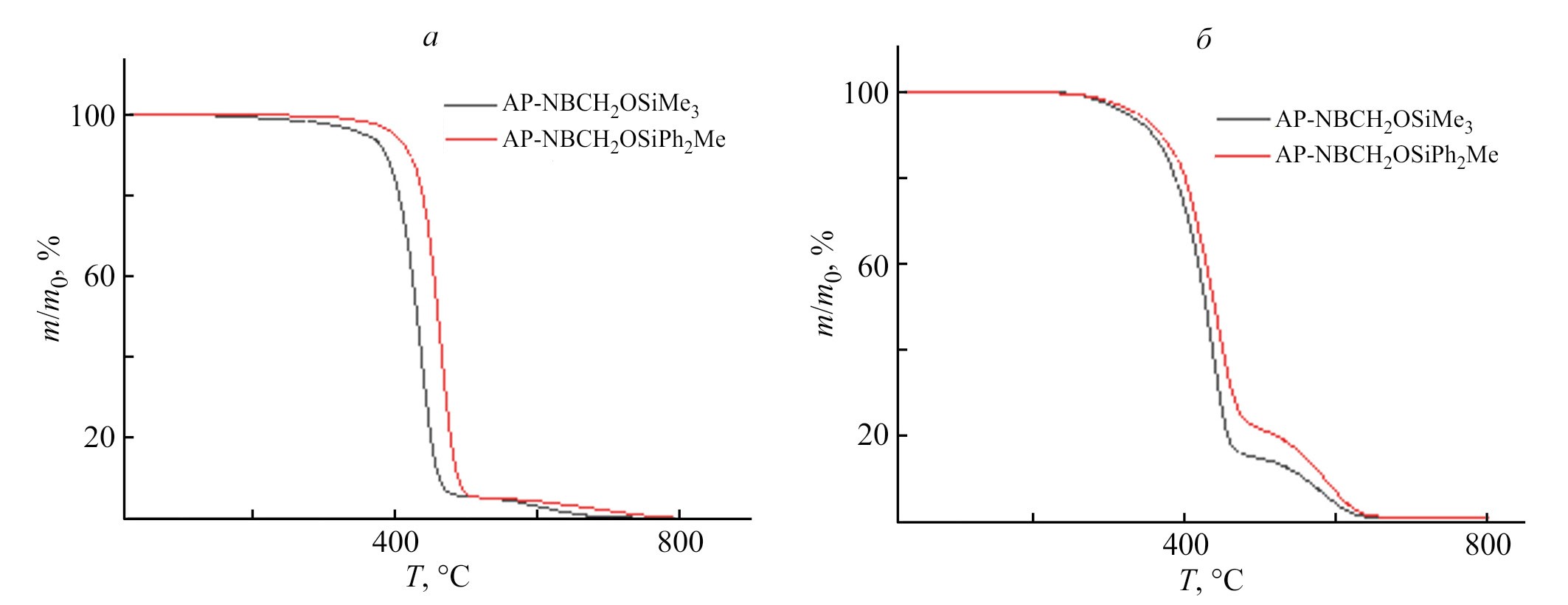 Рис. 2. Кривые термогравиметрического анализа аддитивных полимеров на основе кремнийорганических производных NBCH2OH с метильными [12] и фенильными группами в атмосфере аргона (а) и на воздухе (б)