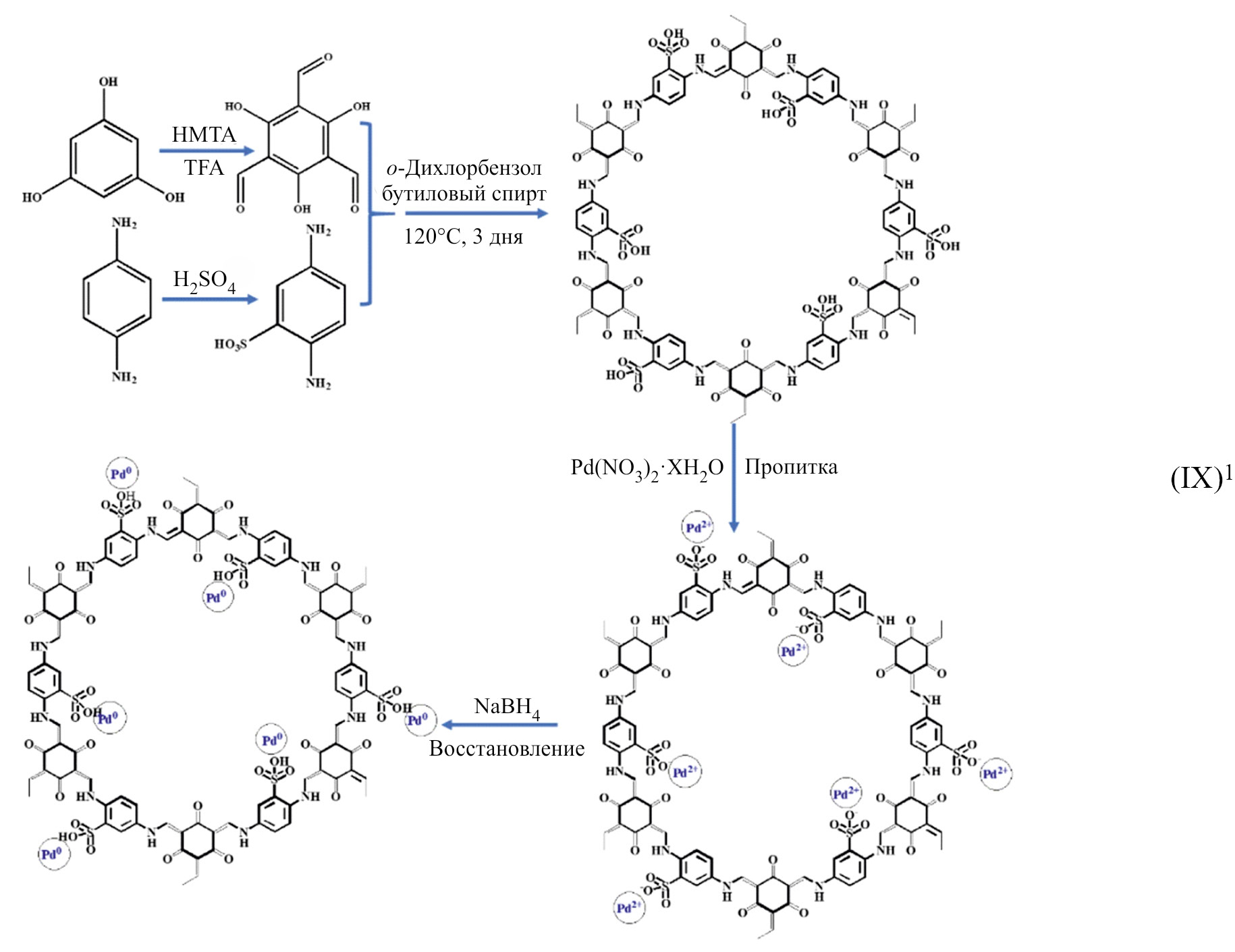 Метод постмодификации нашел широкое применение и для упорядоченных мезопористых углеродных материалов, в частности фенол-формальдегидных полимеров. Данные материалы обладают преимуществами органических полимеров (высокой гидрофобностью, термической и химической стабильностью) и текстурными характеристиками, схожими с таковыми для неорганических мезопористых материалов (упорядоченной и регулируемой пористой структурой, высокими значениями удельной площади поверхности) [100]. Структурирование полимера осуществляется за счет использования в синтезе темплатов (чаще всего Pluronic F127), которые затем удаляют отжигом [101]. Хотя фенол-формальдегидные носители содержат в своей структуре кислородсодержащие группы, следует отметить, что их действия оказывается недостаточно для получения равномерного распределения частиц по размерам и в структуре материалов при нанесении палладия [102]. Варианты премодификации для данных материалов ограниченно доступны из-за высокотемпературной стадии отжига темплата, при которой многие заместители могут претерпевать деструкцию.