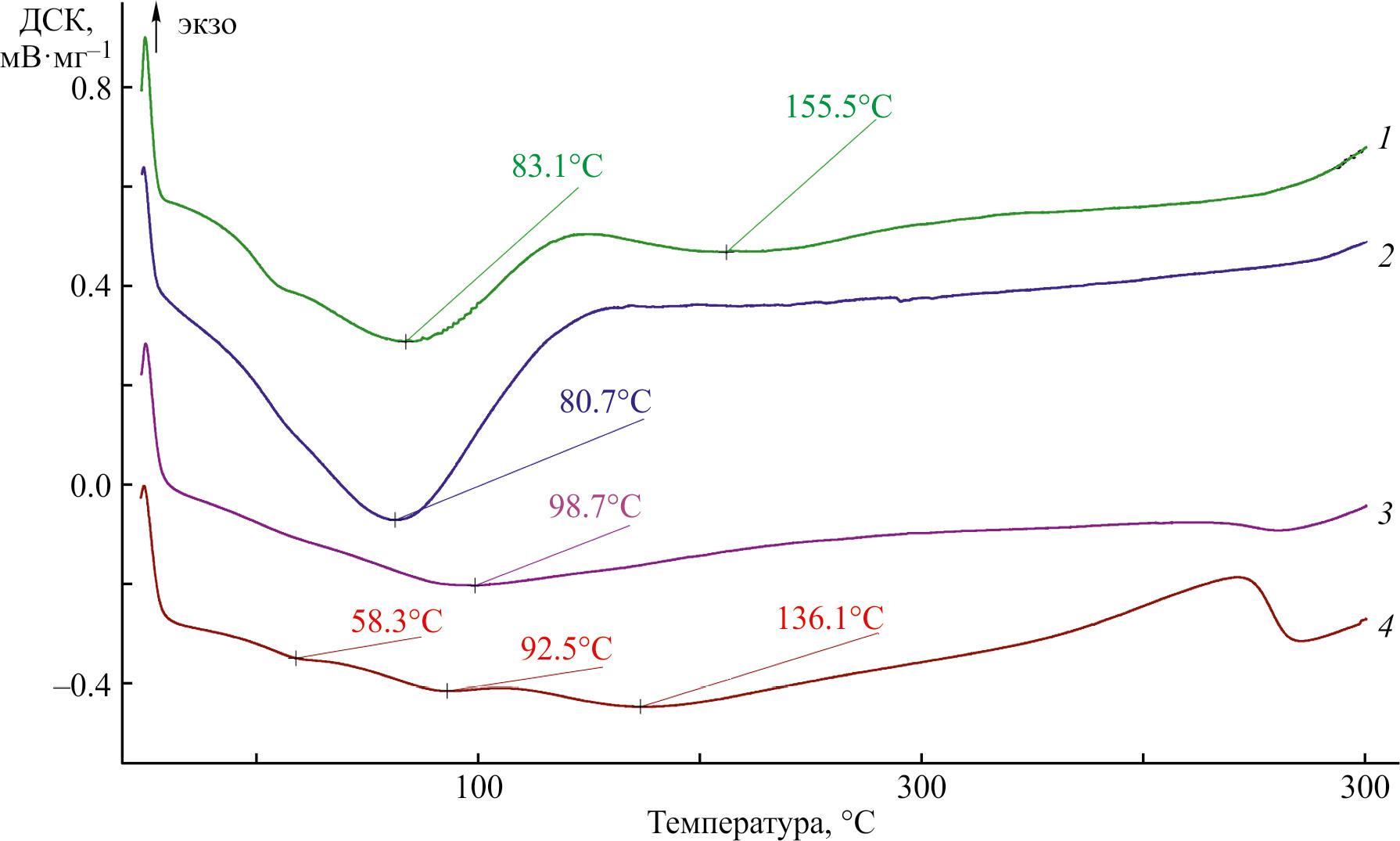 Рис. 3. Кривые ДСК для образцов полимеров TGDE-12sb (1), TGDE-12sa (2), TGDE-11sb (3), TGDE-11sa (4).
