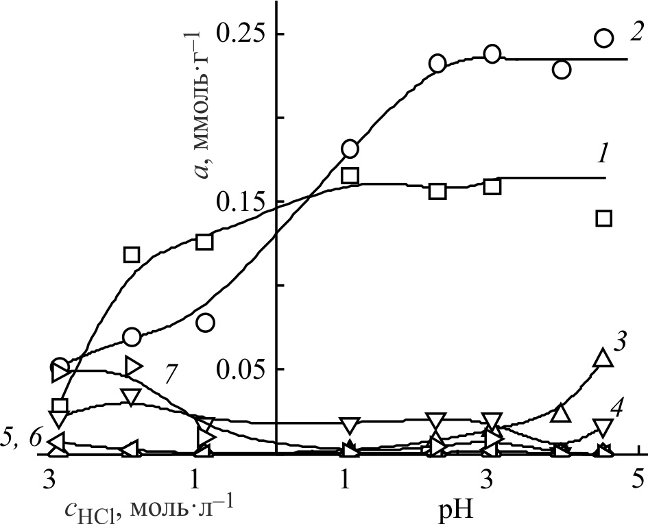Рис 3. Влияние кислотности среды на сорбцию: 1 — Pd(II), 2 — Au(III), 3 — Cu(II), 4 — Cd(II), 5 — Co(II), 6 — Ni(II), 7 — Zn(II)) — при их совместном присутствии в солянокислых растворах сшитым поли(N-винилимидазолом).