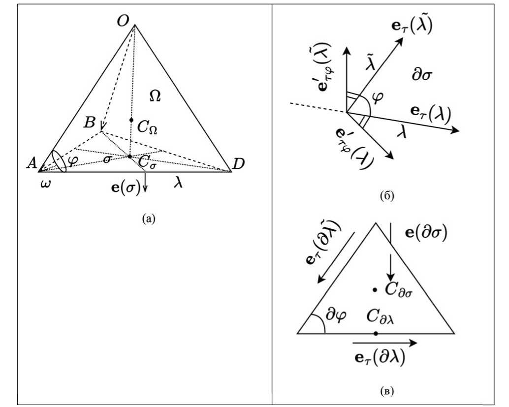Вектор отложен от центра тяжести треугольной граничной грани к середине граничного ребра ; — поверхностные базисы внутри грани ; ; — площадь треугольной грани , содержащей поверхностный базис . Аналогично введена граничная знаковая функция , равная единице, когда нормаль — внешняя к аппроксимации области О, и минус единице, если нормаль — внутренняя к аппроксимации данной области.