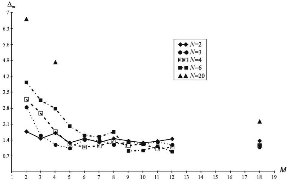 Фиг. 5. Изменение Dm в зависимости от N, M по формуле (3.7).