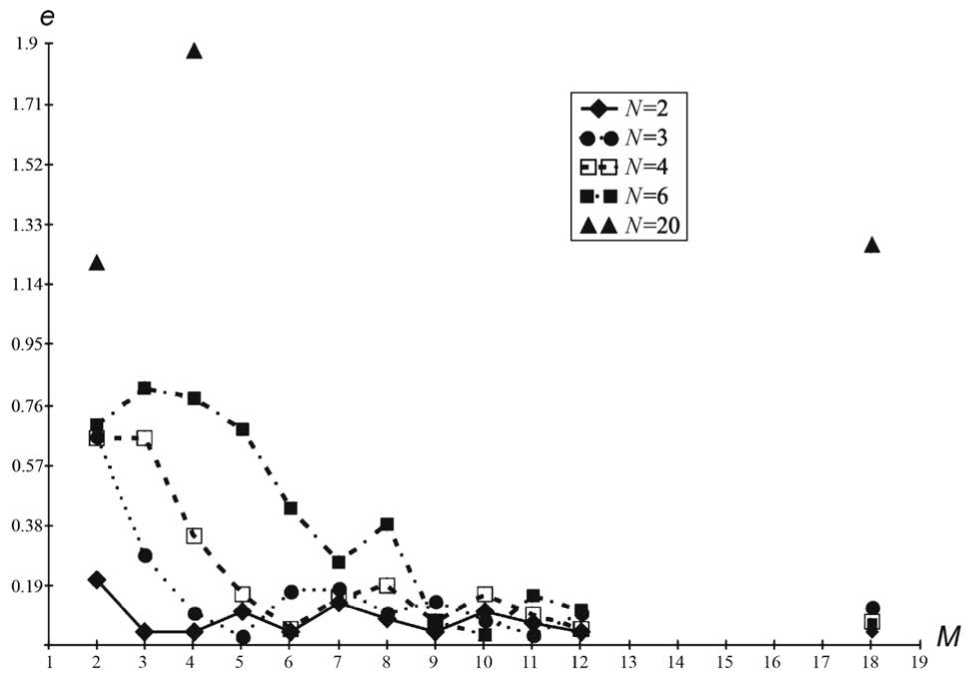 Фиг. 7. Численные результаты изменения e в зависимости от N, M.