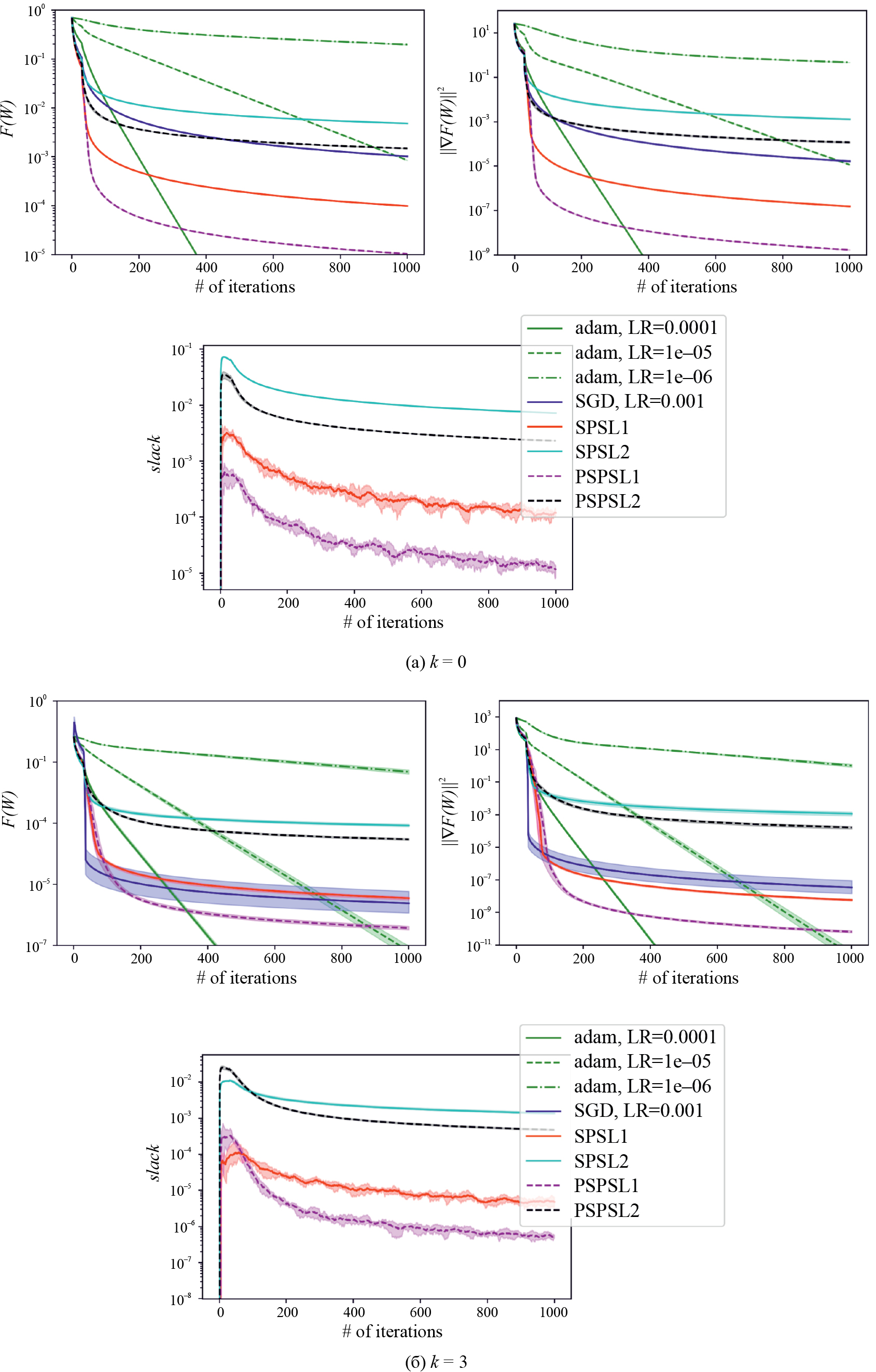 Мы также сравниваем наши методы с оригинальными SPS, SPSL1, SPSL2, SGD и Adam (фиг. 4 и 5).