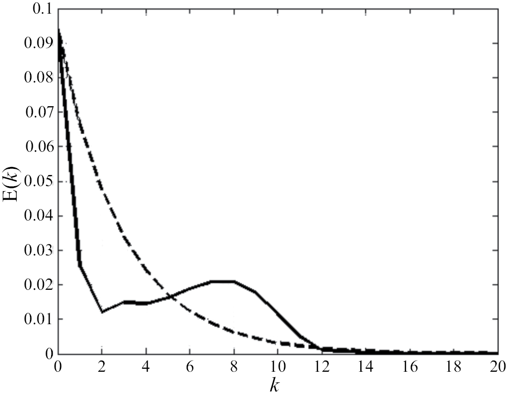 Для алгоритмов второго порядка при τ0 = 1 естественно задавать τ1, не превышающим 1, иначе обновленная информация будет подавляться устаревшей. При 0 < τ1 < 1 получаем ускорение сходимости относительно алгоритма первого порядка. При τ1 > 1 в силу преобладания устаревшей информации происходит нарушение монотонности изменения E(k) и замедление скорости сходимости относительно алгоритма первого порядка. На фиг. 2 представлено сравнение алгоритма первого порядка и алгоритма второго порядка при τ1 = 0.8, при этом