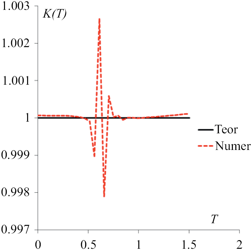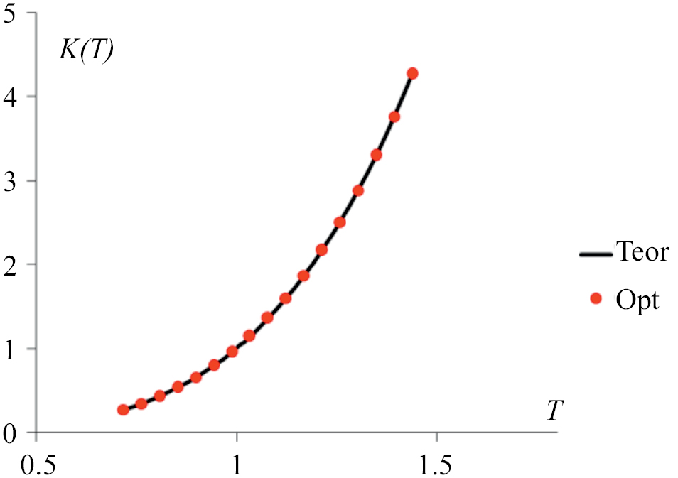 Заметим, что функция является аналитическим решением уравнения (1.1) при C(T) = 2 и K(T) = 1, так что пара {C(T), K(T)} = {2, 1} и функция являются оптимальным управлением и соответствующим оптимальным решением обратной задачи (1.1)—(1.4) с данными (3.2).