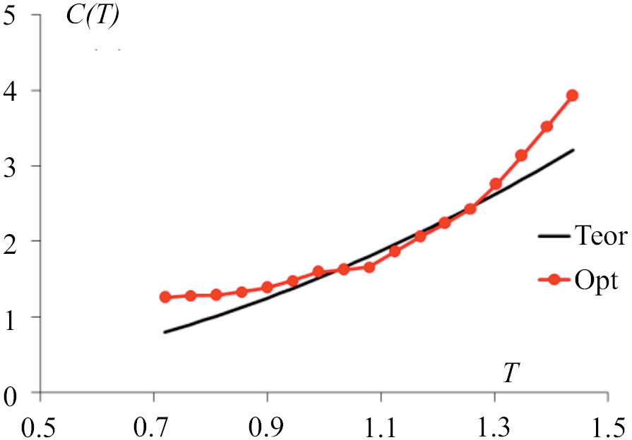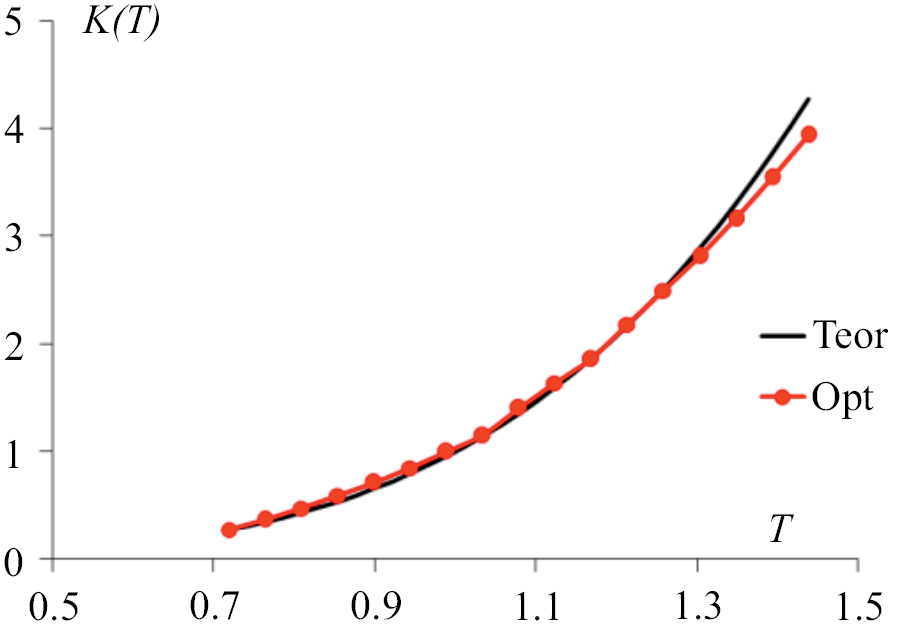 Вначале при решении задачи оптимизации функционала (1.4) интервал времени Θ = 1.5. Температура на левом конце слоя в этом случае изменяется от 1.246 до 1.762, а на правом — от 0.7192 до 1.438 (есть общий диапазон температур). В качестве начального приближения выбирались функции C(T) = 1.0 и K(T) = 1.0. Результаты полученного решения обратной задачи представлены на фиг. 1 (функция C(T)) и фиг. 2 (функция K(T)). Расчеты, выполненные с использованием других (отличных от констант) начальных приближений для функций C(T) и K(T), приводили к тому же решению обратной задачи.