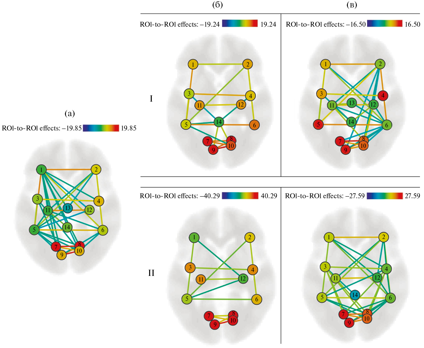 Fig. 3. Functional connections of the executive network according to resting state fMRI data in the observation samples. The figure shows functionally significant relationships (p-FDR corr < 0.05). The color scale corresponds to the size of the effect (T-value). Regions of interest for calculating connectivity are shown in Fig. 1. (a) – healthy subjects (n = 9); (б) – patients with lesions of the left temporal lobe (n = 7); (в) – patients with lesions of the right temporal lobe (n = 7). I – before RT; II – 6 months after RT.