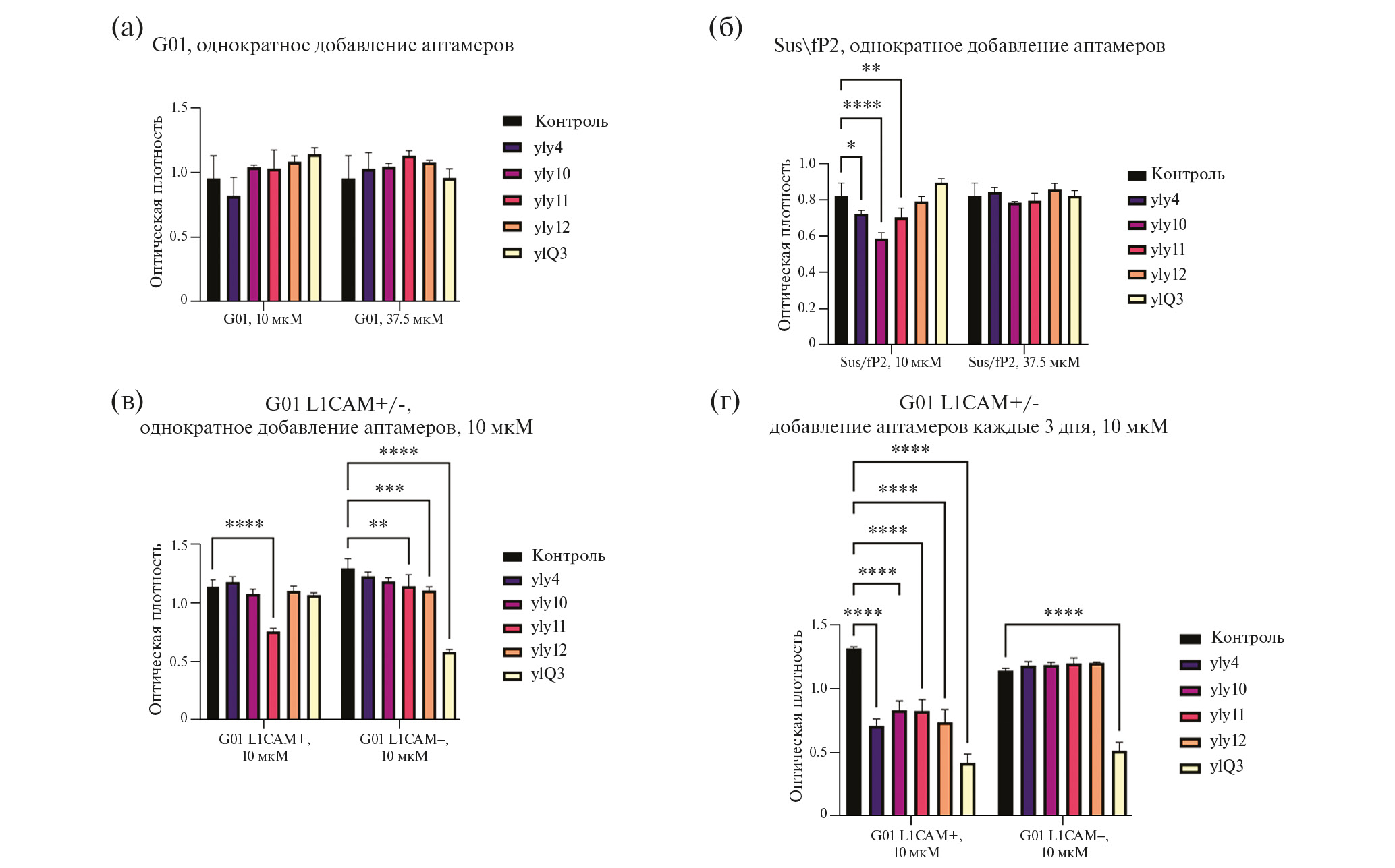 Fig. 2. Results of the MTS assay for single and triple addition of aptamers to L1CAM to human glioblastoma cells. MTS-assays on the 10th day after exposure to L1CAM aptamers yly4, yly10, yly11, yly12, ylQ3 to glioblastoma cells (а) – G01, (б) – Sus\fP2 in concentrations 10 mcM and 37.5 mcM. MTS-assays on the 10th day after exposure to L1CAM aptamers yly4, yly10, yly11, yly12, ylQ3 in concentration 10 mcM to glioblastoma cells G01 L1CAM+ and G01 L1CAM- (в) once and (г) every three days. Data are represented as mean ± SD. n = 3 for each group. Statistically significant differences between the control and the treatment groups are indicated by asterisks (Two-Way ANOVA, post-hoc Bonferroni Test, ** – p < 0.01, *** – p < 0.001, **** p < 0.0001).