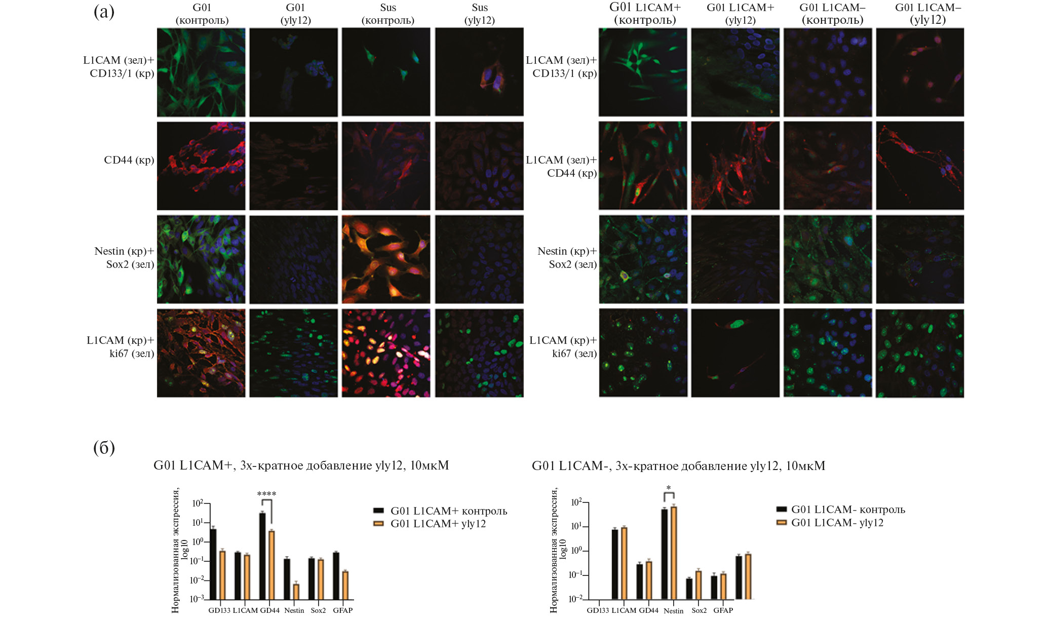 Рис. 3. Иммуноцитохимическое окрашивание клеток глиобластомы G01, Sus\fP2, G01 L1CAM⁺ и G01 L1CAM⁻ и ПЦР-анализ клеток глиобластомы G01 L1CAM⁺ и G01 L1CAM⁻ после воздействия аптамером к L1CAM yly12. (а) – иммуноцитохимическое окрашивание клеток G01, Sus\fP2, G01 L1CAM⁺ и G01 L1CAM⁻ после воздействия аптамером yly12 на маркеры стволовости CD133, L1CAM, CD44, Nestin, Sox2 и маркер пролиферирующих клеток ki67. Зел – зеленое свечение, кр – красное свечение. Ядра клеток окрашивали раствором бисбензимида (Hoechst 33342) – синее свечение. (б) – ПЦР-РВ генов, ассоциированных со стволовостью CD133, L1CAM, CD44, Nestin, Sox2 и GFAP, в культурах клеток G01 L1CAM⁺ и G01 L1CAM⁻ после воздействия аптамером yly12. Статистически значимые различия показаны с помощью астериксов (Two-Way ANOVA, post-hoc Bonferroni test, * – p < 0.05, **** – p < 0.0001).