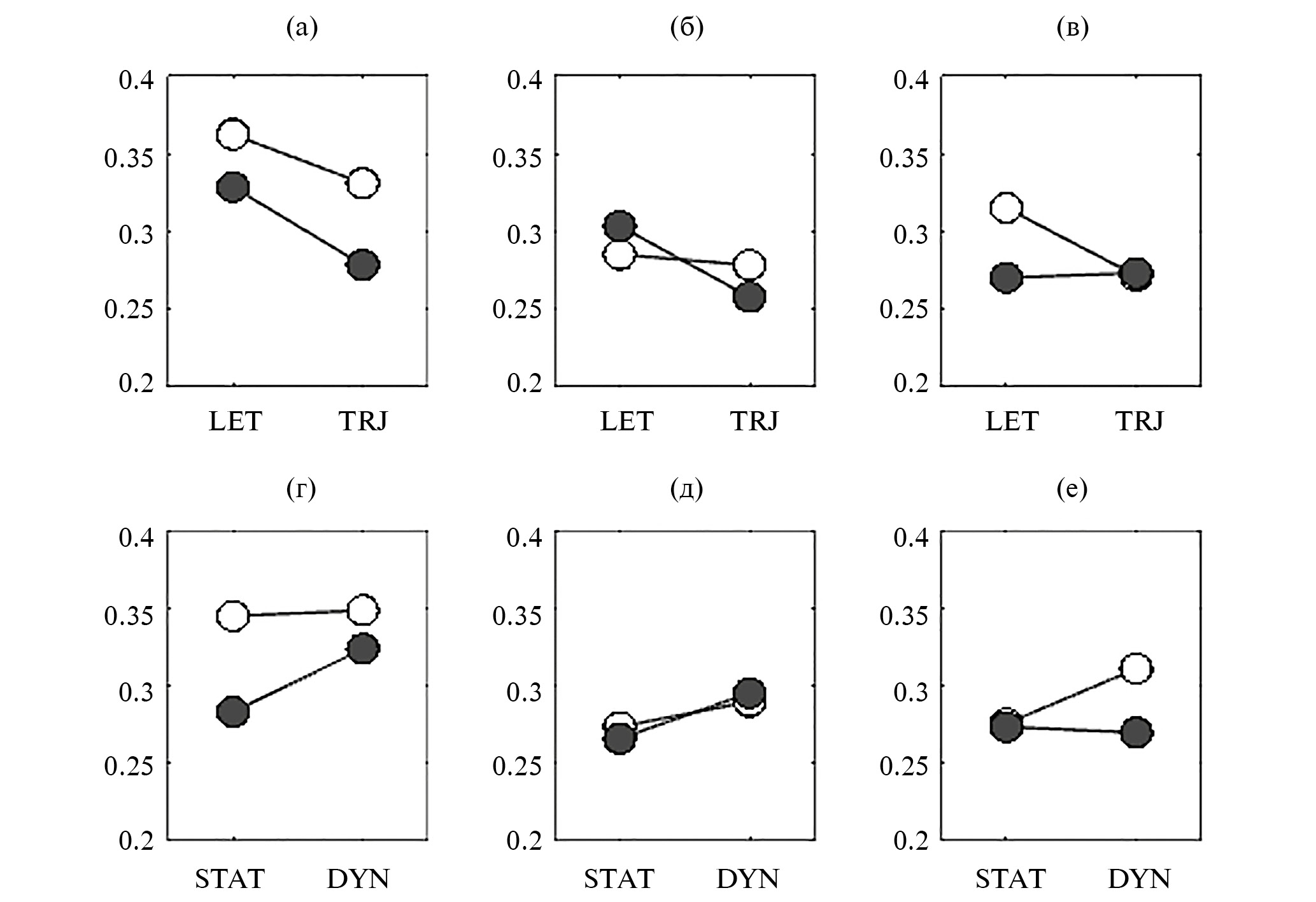 Последовательности предъявлялись в двух режимах – статическом (STAT) и динамическом (DYN). В статическом режиме последовательность предъявлялась одновременно вся целиком на фиксированное время (T = 2000 мс). В этом режиме в случае LET предъявлялась строчка букв, а в случае TRJ – рисунок ломаной. В динамическом режиме в случае LET буквы предъявлялись одна за другой, каждая на своем месте в строке. В случае TRJ вдоль невидимой траектории двигалось небольшое круглое пятно. В случае LET, так же как и в случае TRJ, время экспозиции одного элемента (буквы или отрезка) составляло 500 мс. Примеры буквенных последовательностей и траекторий можно найти в нашей предыдущей работе (Корнеев и др., 2022).