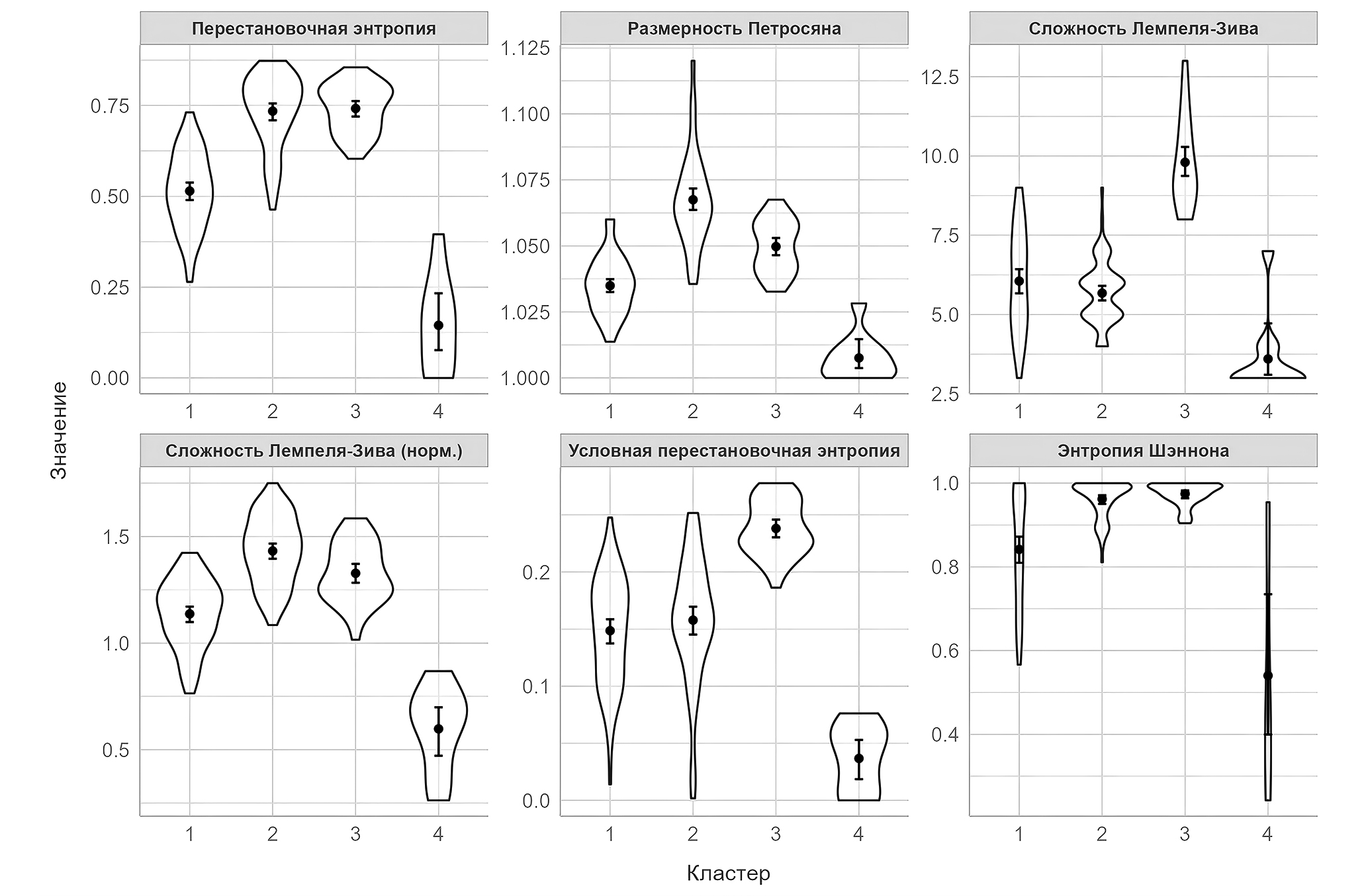 Рис. 2. Распределения показателей сложности в каждом из четырех кластеров (представлены в виде усеченных скрипичных графиков), а также их средние значения с 95%-ми доверительными интервалами (представлены в виде точек с усиками). Номера кластеров представлены по осям X, а значения конкретного показателя представлены по осям Y. Доверительные интервалы были построены с использованием алгоритма BCA-bootstrap (Efron, 1987).