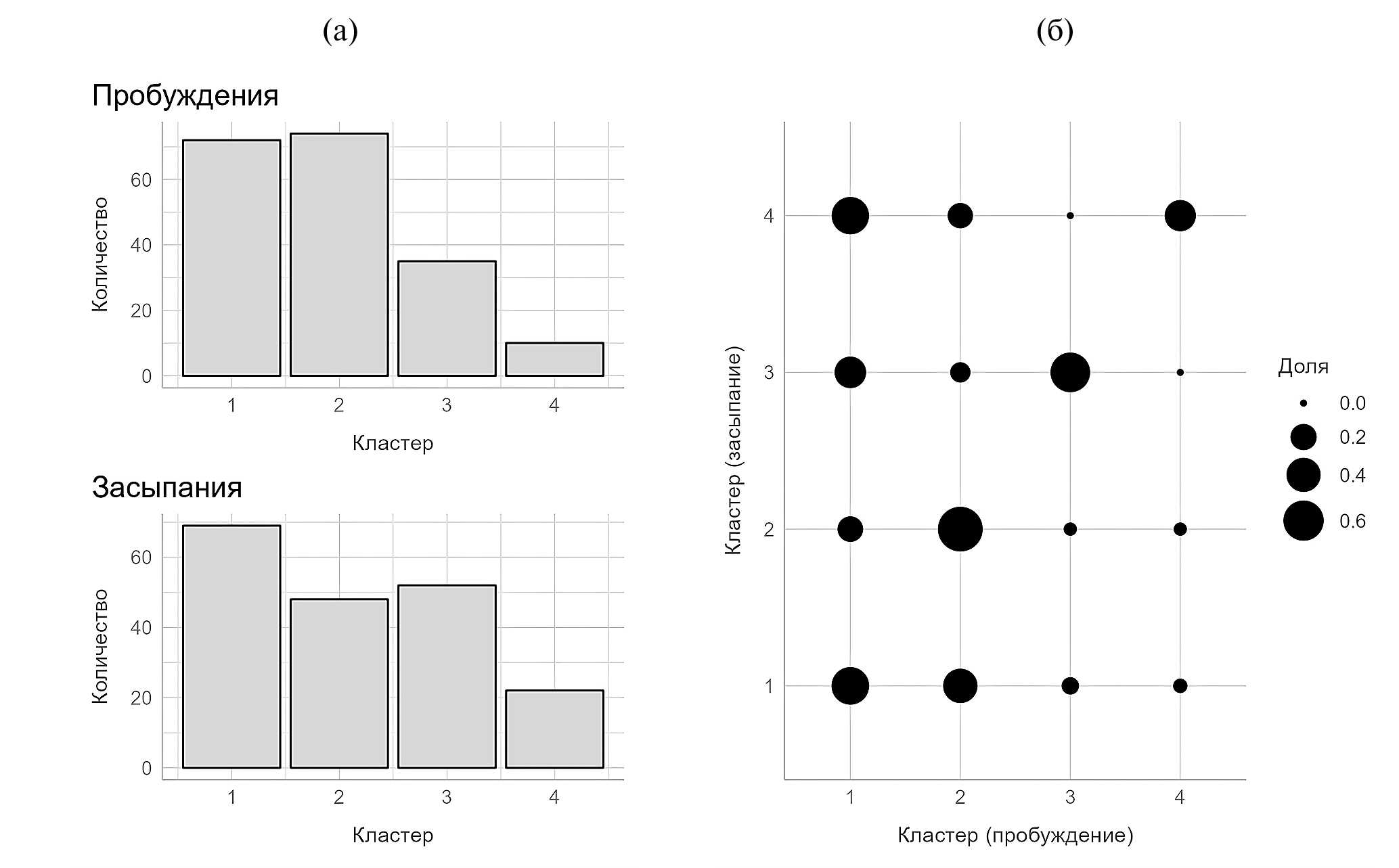Fig. 3. (а) – the sizes of clusters obtained on the basis of sleep-wake transitions (upper part of the graph) and the sizes of similar clusters obtained on the basis of wake-sleep transitions (lower part of the graph). The cluster number is shown on the X–axis, and the number of observations in each cluster is shown on the Y-axis. (б) – a diagram showing the proportions of each combination of “wake-sleep cluster – sleep-wake cluster” relative to all variants for each wake-sleep cluster separately. “Sleep-wake clusters” are represented on the X–axis, and “wake-sleep clusters” on the Y-axis. The diameter of the point encodes the proportion – the larger the point, the greater the proportion of such a cluster combination.