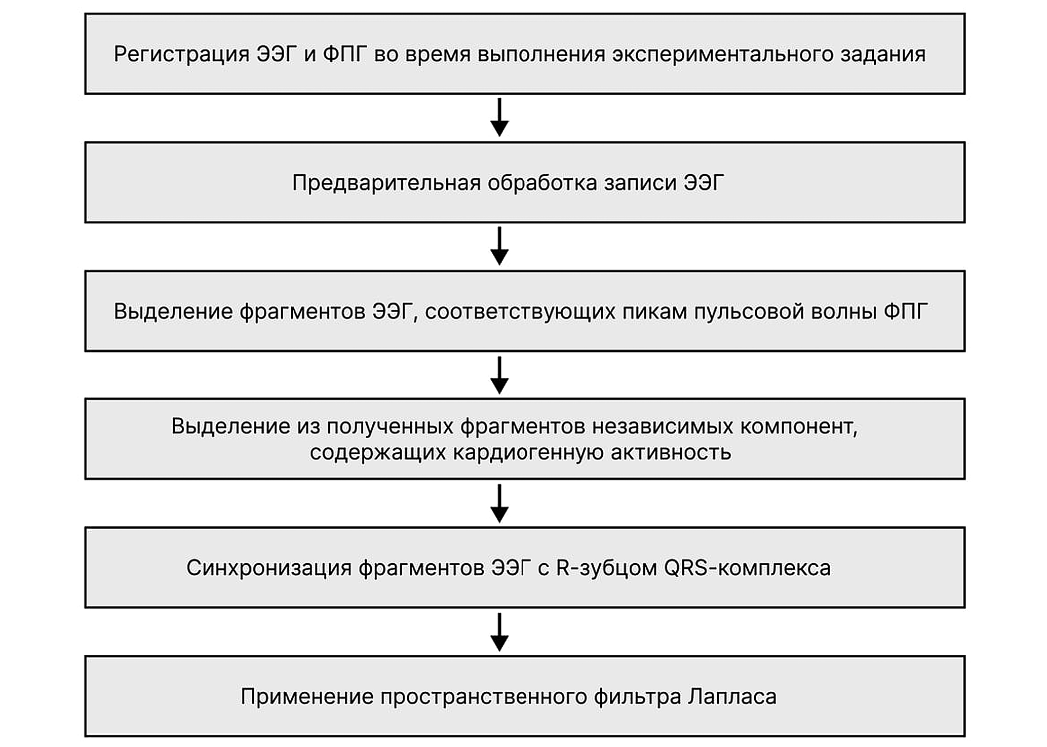 В данной работе на примере энцефалограммы одного репрезентативного участника эксперимента ХХ033 (Ж, 35 лет) будут рассмотрены все этапы выделения из ЭЭГ кардиогенной активности путем синхронизации с фотоплетизмограммой, начиная с предварительной обработки записи (рис. 1). Помимо задачи описания алгоритма применения МНК, будут рассмотрены задачи поиска компонент, содержащих ЭКГ-артефакты, определения минимального необходимого количества ЭЭГ-фрагментов и обоснования необходимости синхронизации ЭЭГ с ударами сердца для успешного применения МНК. На примере записи DM017 (М, 21 год) будет рассмотрена возможность применения МНК для выделения кардиогенной активности без синхронизации с ФПГ. Далее будет показано, каким образом с помощью метода независимых компонент из электроэнцефалограммы можно выделить электрический сигнал сердца и с точностью до миллисекунд определить время возникновения R-зубца кардиограммы с учетом межиндивидуальной вариабельности соотношения R-зубца и пика пульсовой волны. На примере записи DM024 (Ж, 25) с помощью параллельной регистрации электрокардиограммы (ЭКГ) и ФПГ будет показано, что временной интервал между R-зубцом и пиком пульсовой волны ФПГ является постоянной величиной с маленькой дисперсией значений. Будет представлен вызванный потенциал, полученный после удаления из записи кардиогенной активности. С помощью пространственного фильтра Лапласа будет показано, что полученный вызванный потенциал имеет мозговое происхождение.