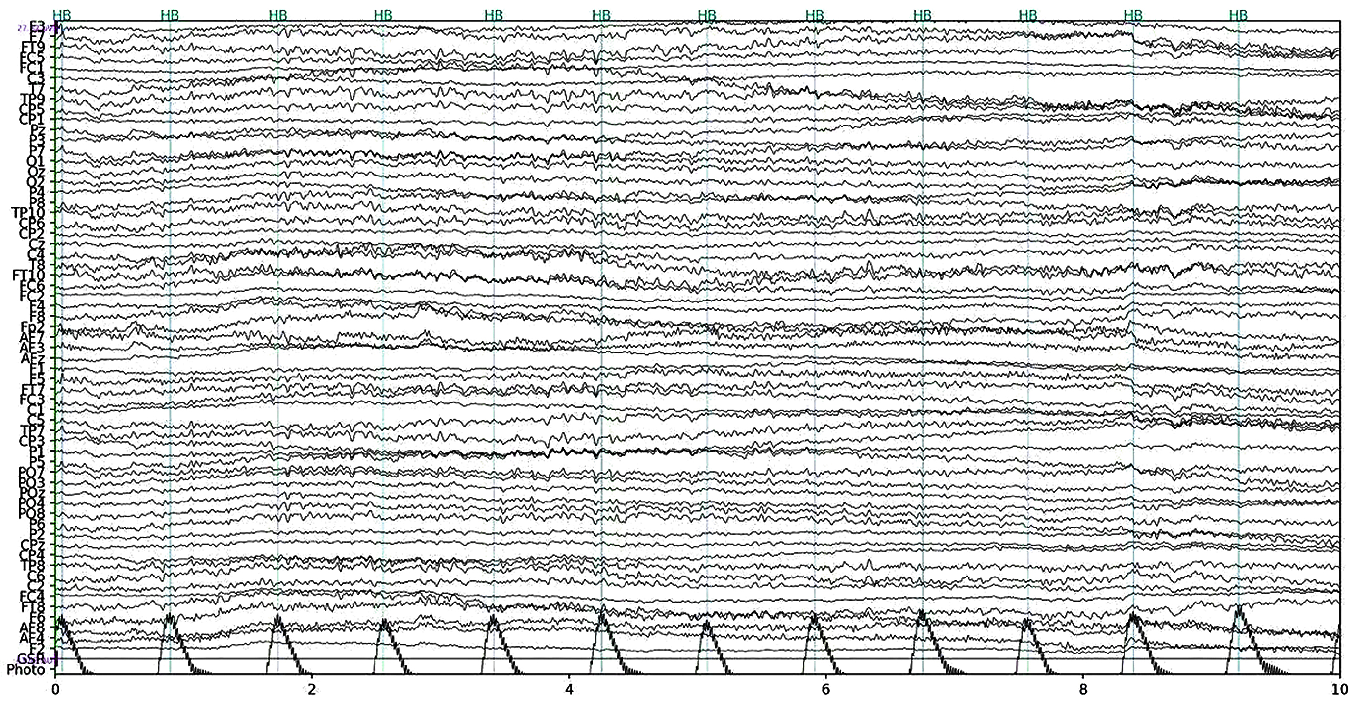 Для записи электроэнцефалограммы использовалось 64 отведения, расположенных в соответствии с системой 10–10, референтный электрод – FCz. Исходная частота дискретизации 500 Гц, частотный диапазон 0–250 Гц. Одновременно проводилась регистрация частоты сердечных сокращений с помощью фотоплетизмографии. Пример записи представлен на рис. 2.