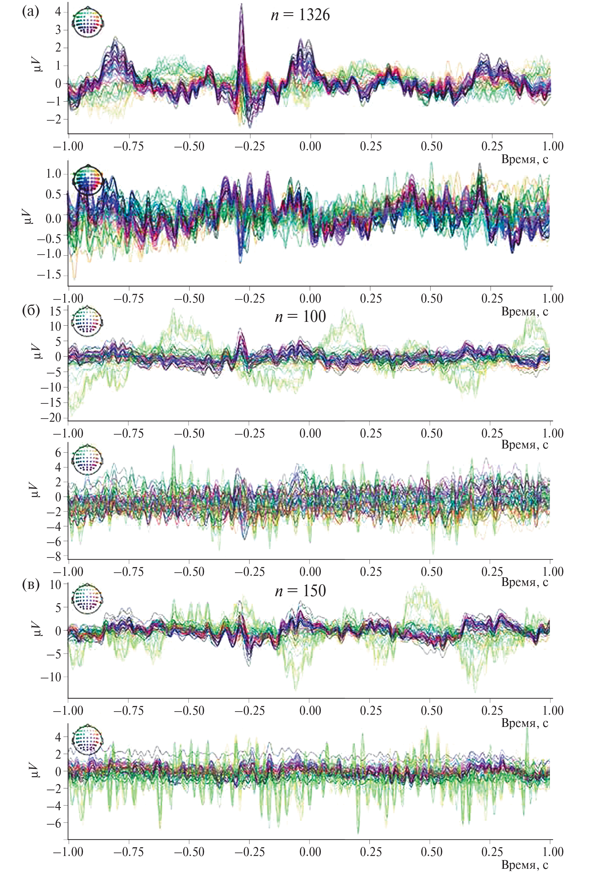 Рис. 3. Вызванный потенциал, синхронизированный с ударами сердца, полученный в результате усреднения разного количества индивидуальных эпох: 1326 (а), 100 (б) и 150 (в). Для каждого усреднения представлено по два рисунка. Верхний рисунок отражает результат, полученный до удаления независимых компонент (НК), содержащих кардиогенные артефакты, а нижний – после.