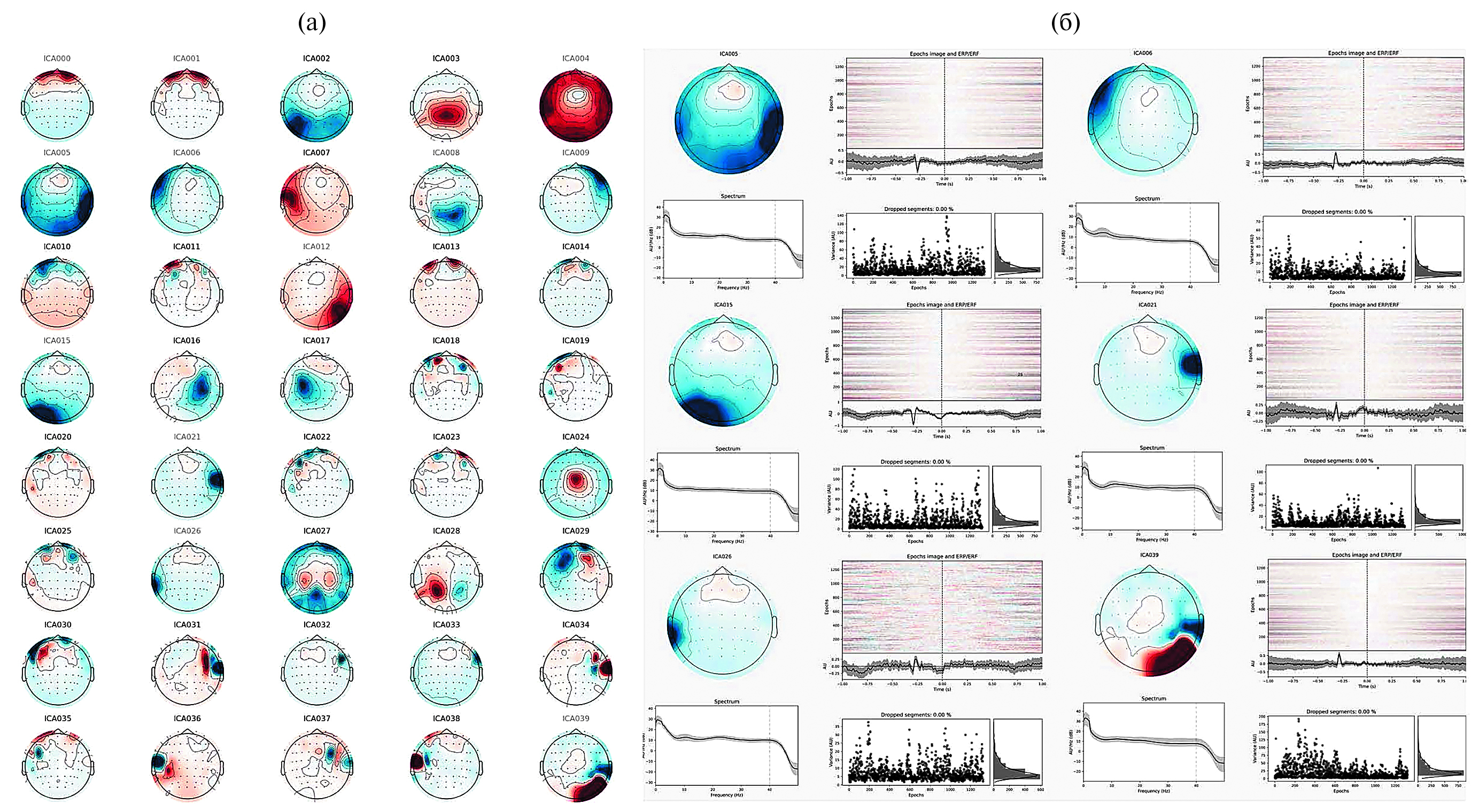 Fig. 4. 40 ICs extracted from encephalogram XX033 (а). ID numbers of ICs with eye movement (0 and 1) and ECG (4, 5, 6, 8, 9, 12, 21, 26, 39) artifacts are grayed out. Topography, averaged epochs, frequency spectrum and signal variability among epochs of ICs with ECG artifacts (б).