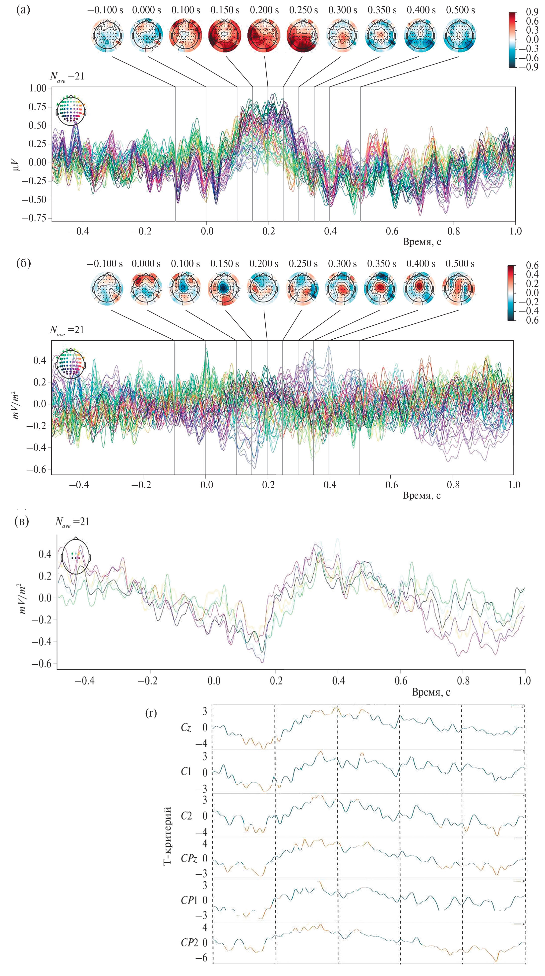 Применение фильтра CSD показало, что наиболее узкую пространственную локализацию имеет активность центральных отведений: Cz, C1, C2, CPz, CP1, CP2 (рис. 6 (б-в)). Статистический анализ с помощью одновыборочного Т-критерия показал, что в этих отведениях значимое понижение амплитуды наблюдается в интервале 0–200 мс после удара сердца, а значимое повышение — в интервале 250–500 мс после удара сердца, что согласуется с данными, описанными в литературе (рис. 6 (г)).