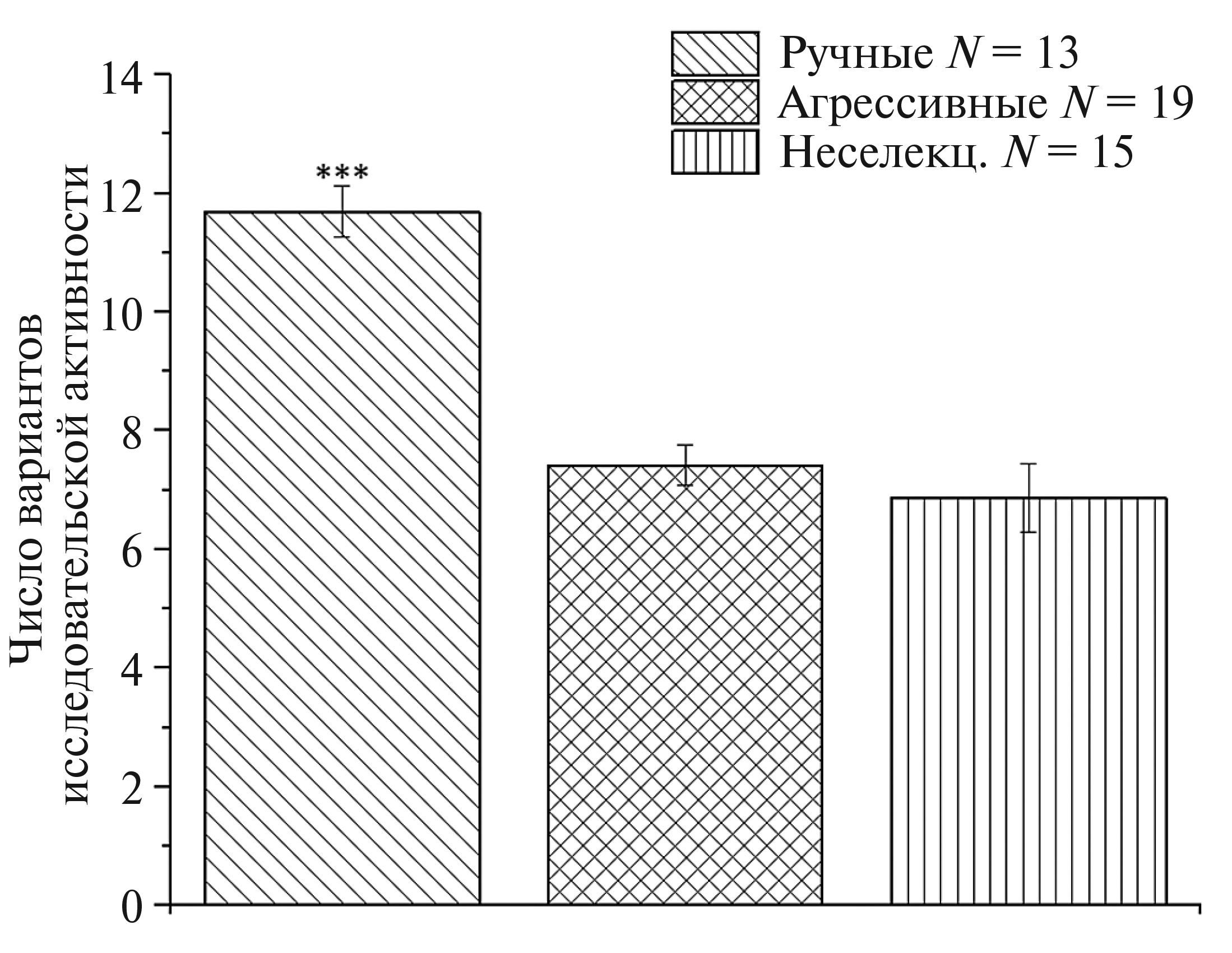 Рис. 1. Число вариантов поведенческих реакций исследовательской активности по отношению к новому объекту (педаль), используемых лисицей в течение 2 минут. Тест Манна–Уитни (Mann–Whitney U-test) *** р ≤ 0.001 по сравнению с агрессивными и неселекционируемыми лисицами.