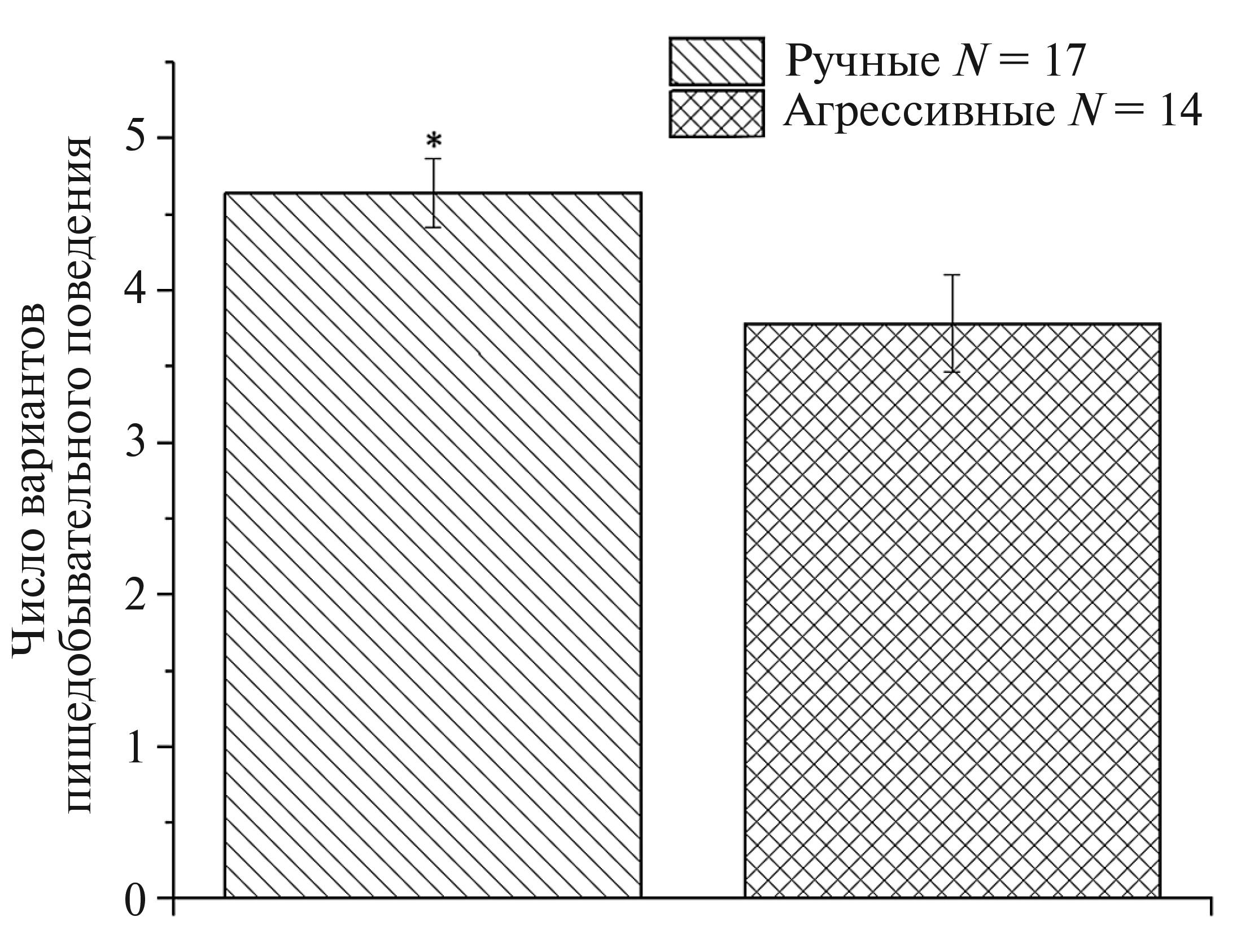 Рис. 2. Число различных вариантов пищедобывательного поведения, используемых лисицами в тесте на угашение навыка фокусировки взгляда. Тест Манна–Уитни (Mann–Whitney U-test) * р ≤ 0.05 по сравнению с агрессивными.