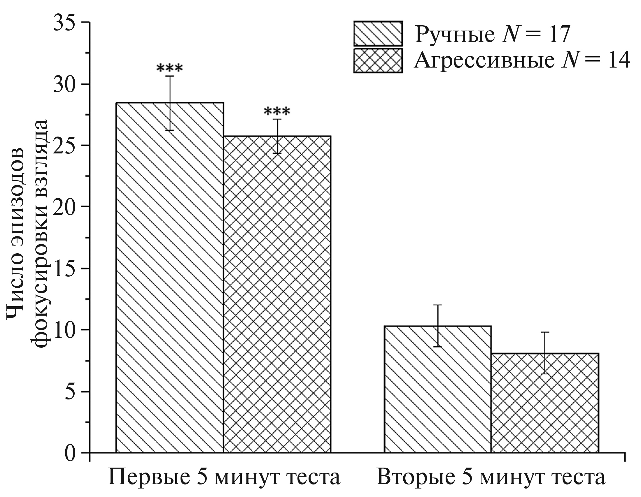 Примечание. Тест Манна–Уитни (Mann–Whitney U-test), *** – р ≤ 0.001, * – р ≤ 0.05, по сравнению с ручными лисицами.