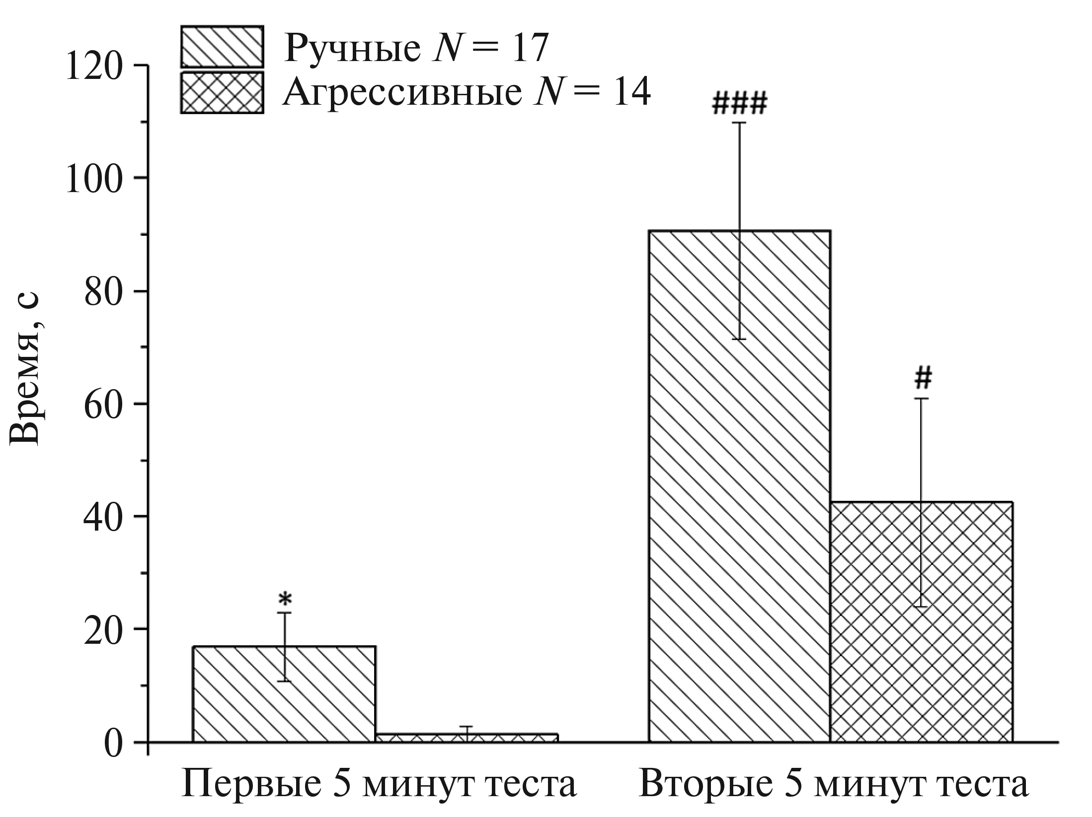 Рис. 4. Время отсутствия двигательной активности (лисица сидит или лежит в стороне от кормушки). Тест Манна–Уитни (Mann–Whitney U-test) *** р ≤ 0.001; # р ≤ 0.05 по сравнению с первой половиной теста. * р ≤ 0.05 по сравнению с агрессивными.