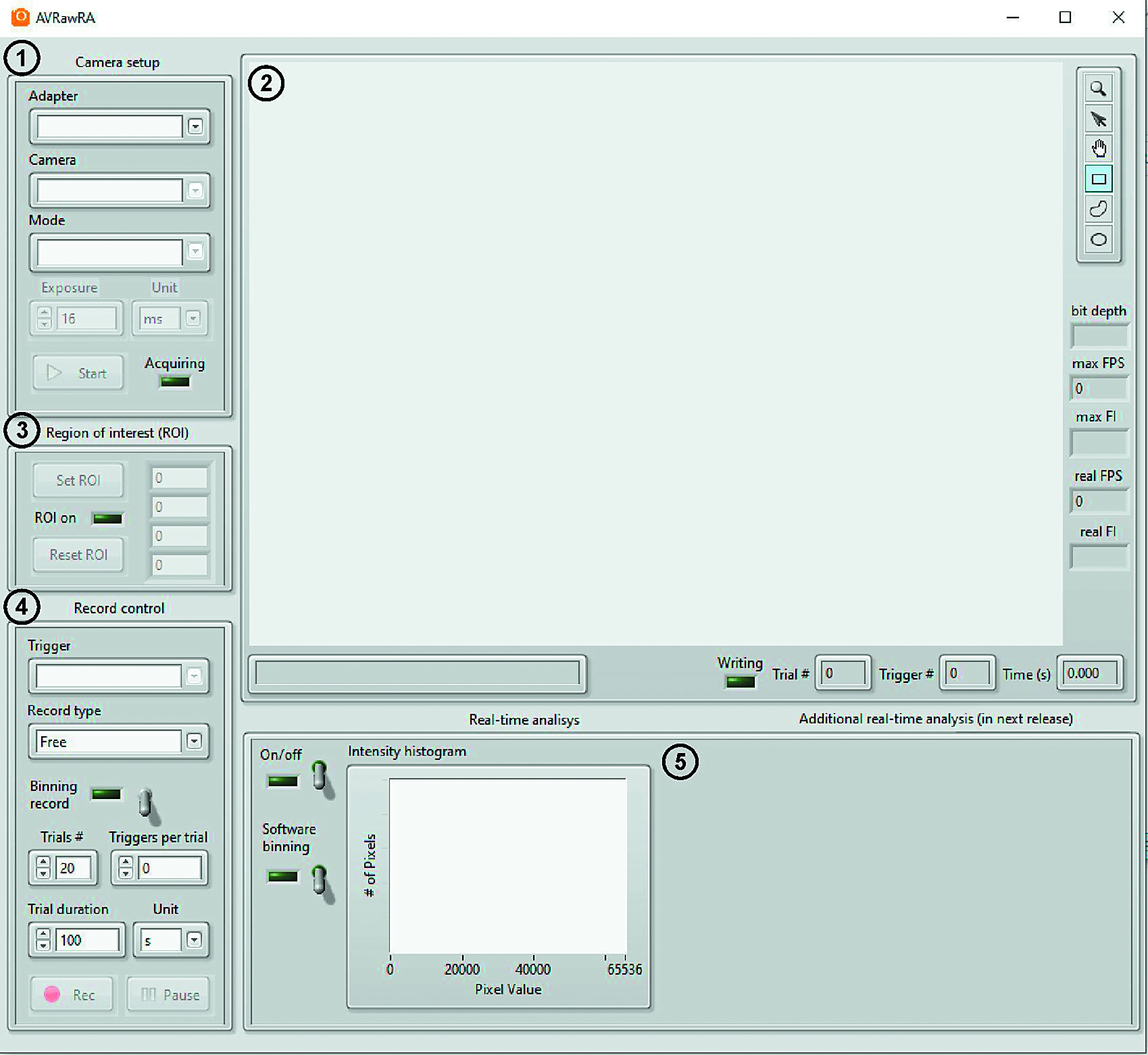 Fig. 1. General view of the AVRawRA user interface. The following panels are presented: 1) “Camera setup” panel; 2) Real-time image visualization panel; 3) “Region of interest (ROI)” panel; 4) “Record control” panel; 5) “Real-time analysis” pane.