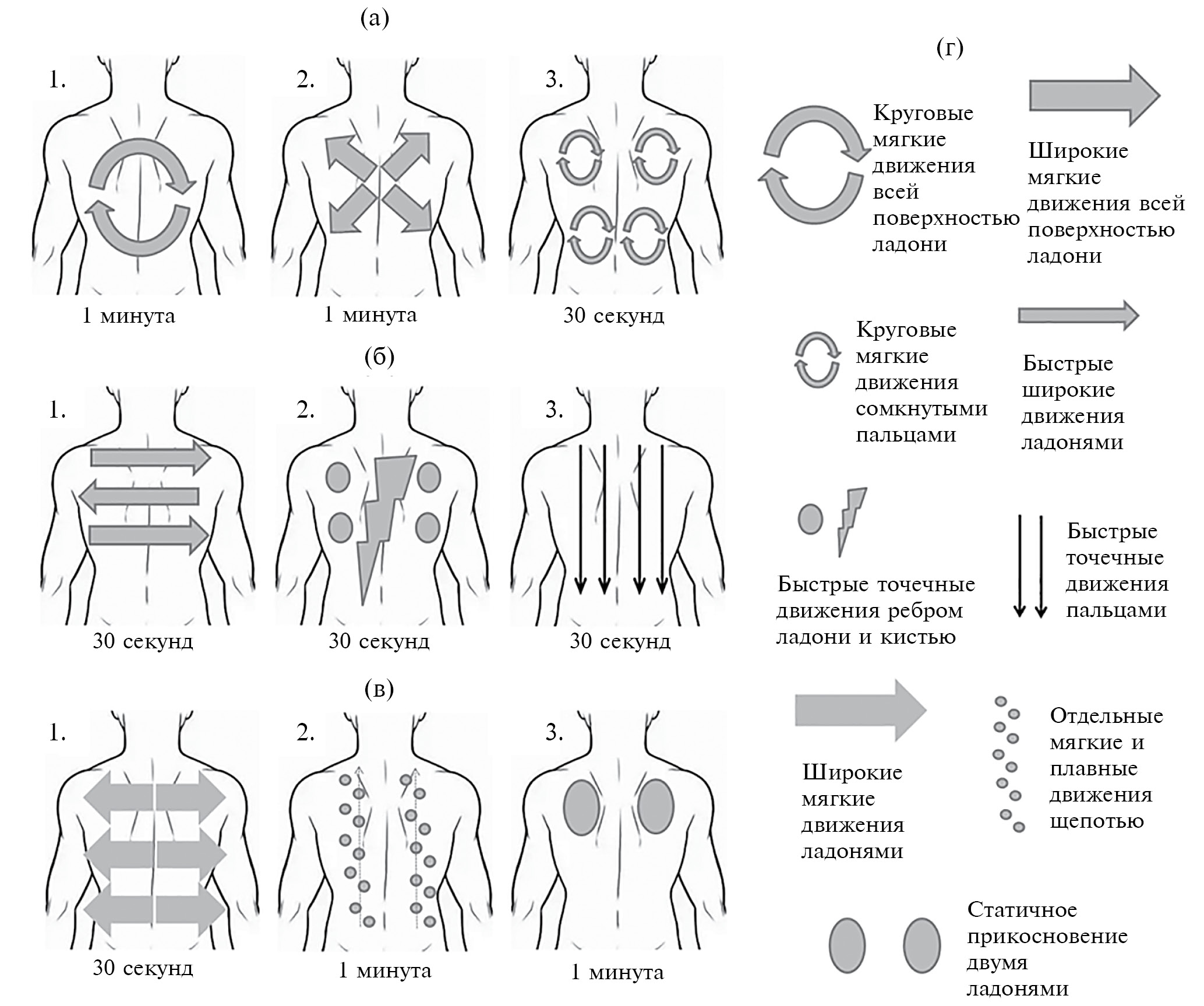 Fig. 1. Graphic description of the massage story “Weather Forecast”, consisting of three stages. Each stage (а, б, в) includes three main movements. Explanations of movements – (г)