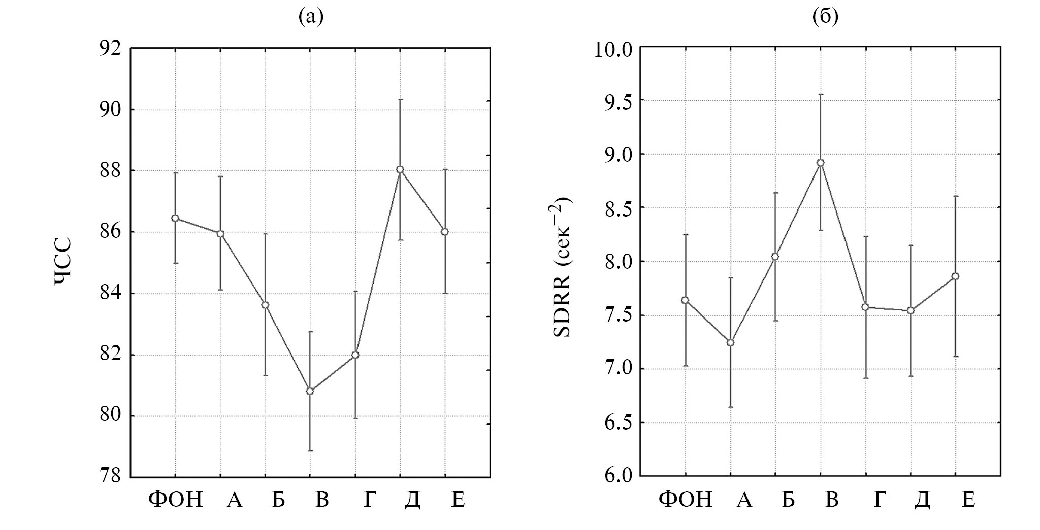 ЧСС анализировался для 7 фрагментов: фоновой записи, трех этапов первой истории, а также второй, третьей и четвертой историй. Были подсчитаны средняя ЧСС и стандартное отклонение между интервалом RR (SDRR).