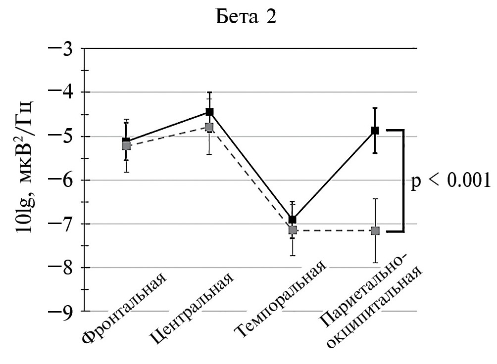 Что касается бета2 и гамма ритмов, то при отсутствии связанных с рассматриваемыми факторами эффектов для суммарных показателей, описанная выше тенденция была характерна для париетально-окципитальной области, где значения мощности ритмов у молодых носителей генотипа 12/12 были выше по сравнению с пожилыми (р < 0.001 бета2 и р = 0.011 в гамма ритмах), при отсутствии возрастных различий в других областях. Поскольку эффекты для высокочастотных ритмов были сходными, на рис. 2 приведены данные только для бета2 ритма.