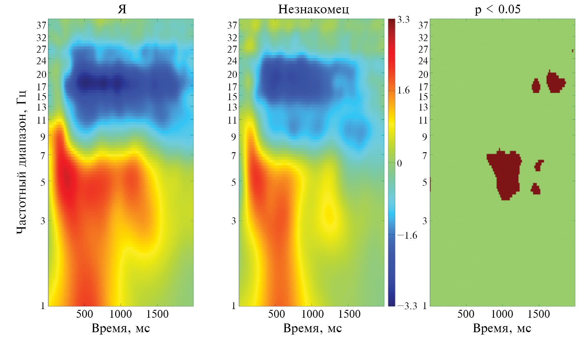 Рис. 1. Связанные с событием спектральные пертурбации (СССП) в частотно-временном разрешении в условии «Я» и условии «Незнакомец». Теплыми цветами показано увеличение спектральной мощности (синхронизация) по сравнению с фоновым интервалом, холодными цветами показано снижение (десинхронизация). Зеленым цветом показаны нулевые значения, где не происходило изменений в спектральной мощности. В правой части рисунка коричневым цветом показаны частотно-временные диапазоны статистически значимых различий между условиями «Я» vs «Незнакомец»