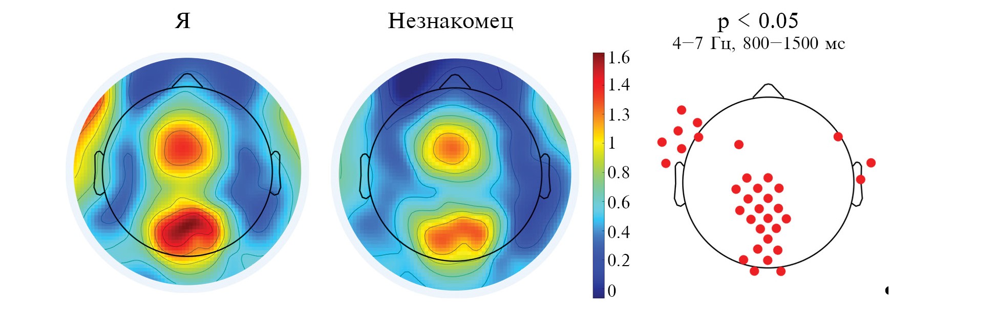 Рис. 2. Распределение по электродам головы СССП в условиях «Я» и «Незнакомец» в тета-частотном диапазоне (4–7 Гц) и во временном интервале от 800 до 1500 мс. Шкала показывает градацию увеличения спектральной мощности тета-ритма от холодных цветов к теплым. В правой части рисунка красным выделены электроды, в которых наблюдались статистически значимые различия между условиями «Я» vs «Незнакомец»