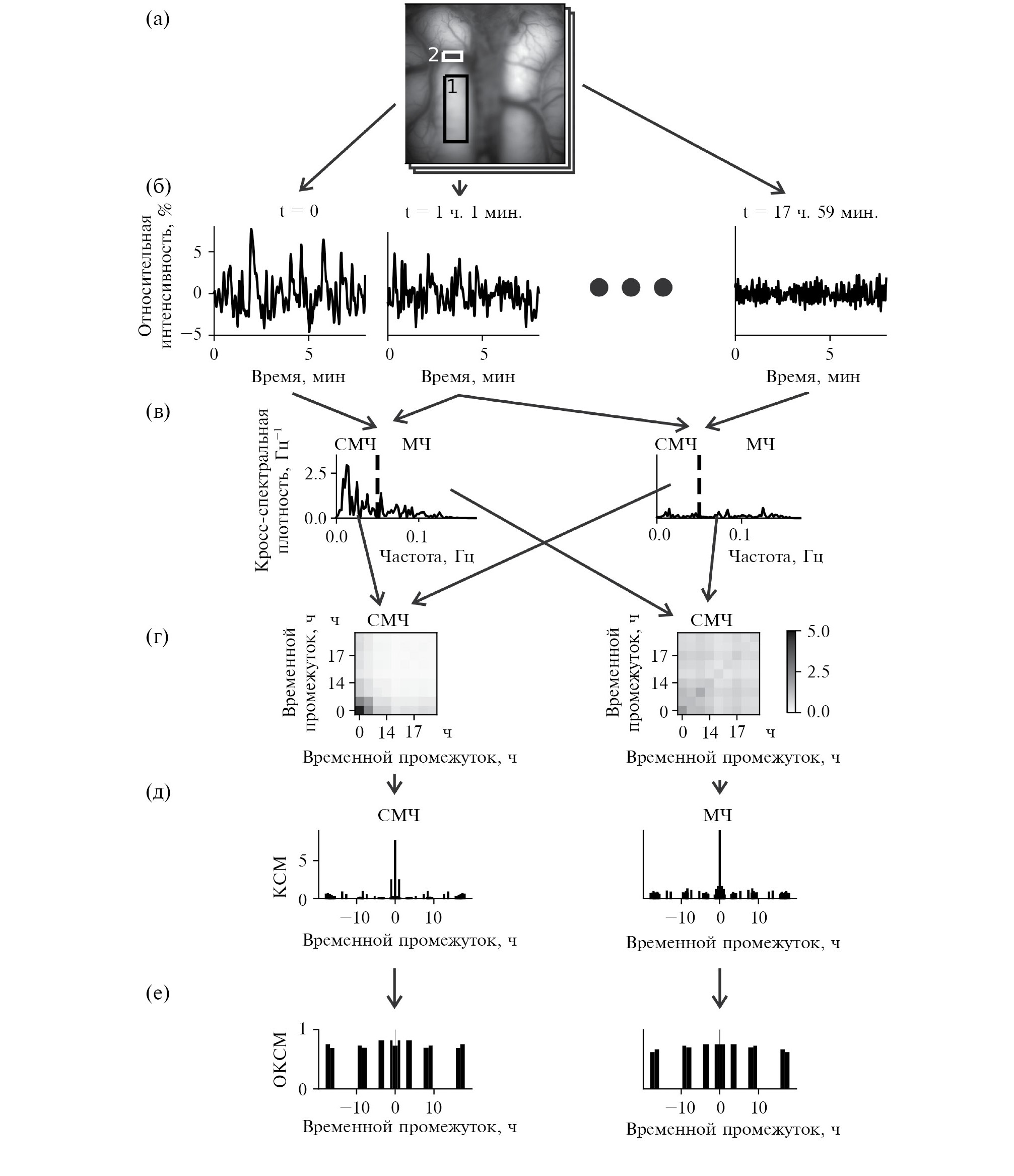 Fig. 2. An example of data processing for the second block of experiments: (а) – an image of the visible part of the cortex recorded by means of intrinsic-signal optical imaging. Designations are the same as in Fig. 1 (a); (б) – examples of vasomotor oscillations recorded at different time sessions. The session start time is at the top of the graphs. The other designations are the same as in Fig. 1 (б); (в) – absolute value of cross-spectral density for pairs of vasomotor oscillations depicted in Fig. (б). A vertical dashed line separated very-low-frequency (at the left) and low-frequency (at-the-right) oscillation ranges; (г) – cross-spectral matrices plotted for very-low-frequency (on the left) and low-frequency (on the right) oscillation ranges. The session start time is depicted on abscissa, another session start time is depicted on ordinate, a color of each point reflects cross-spectrum power for a pair of oscillations related to abcissa and ordinate of that point. Corresponding color code is at the right of both graphs; (д) – dependency of cross-spectral power for two oscillations pairs shown in Fig. (в) and (г) from time lag. A bar height corresponds to the average cross-spectrum power estimated within the 10 minutes interval. Temporary lag value in on the abscissa, cross-spectrum power is on the ordinate; (е) – temporal coherence between records shown above. Time lag is on the abscissa, temporal coherence value is on the ordinate