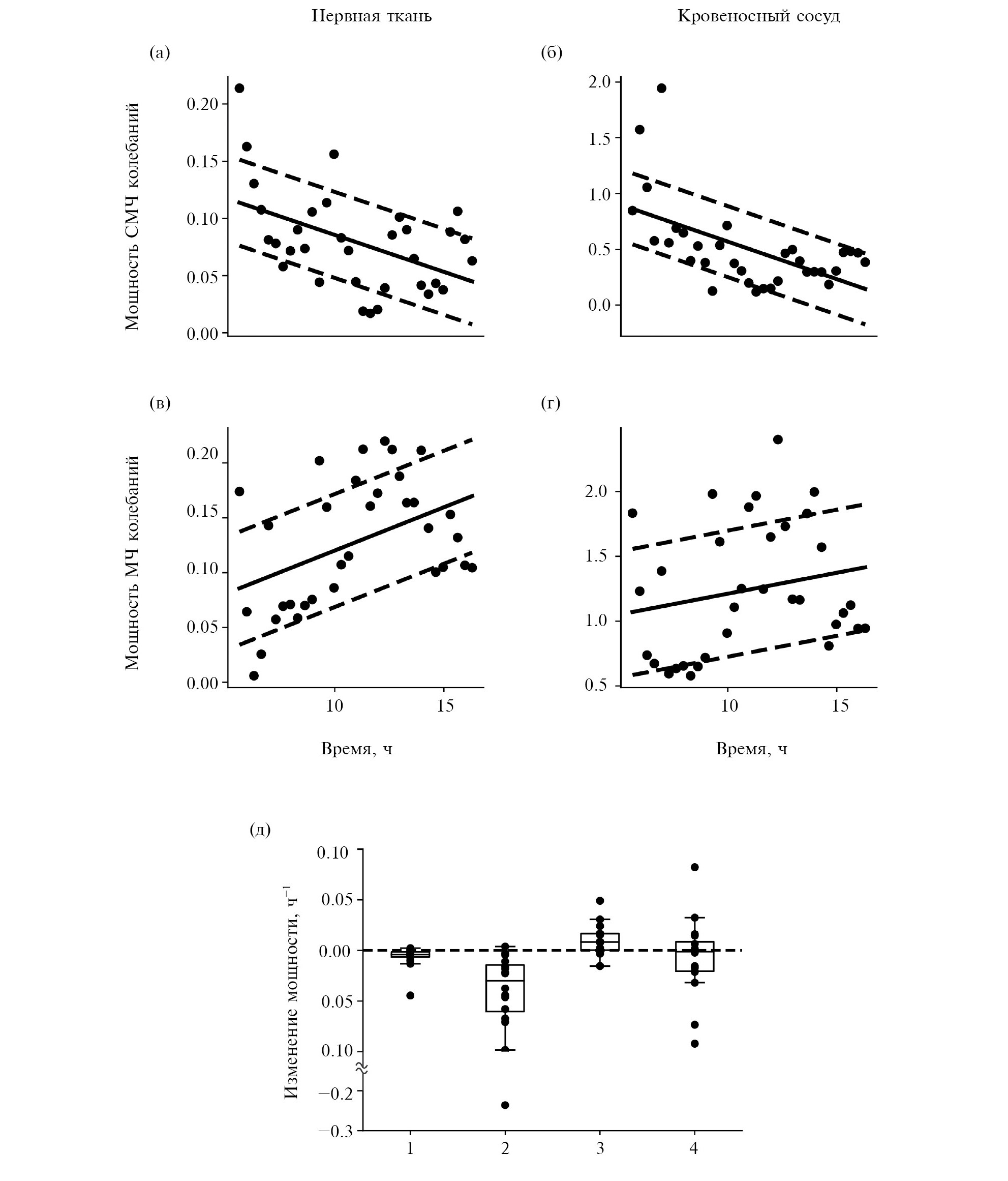 Рис. 3. Зависимость мощности вазомоторных колебаний от времени. (а), (б), (в), (г) – пример подобной зависимости для животного, рассмотренного на рис. 1. На (а), (б) – колебания, зарегистрированные в нервной ткани, на (в) и (г) – колебания, зарегистрированные в кровеносном сосуде. На (а) и (в) – сверхмедленные колебания, на (б) и (г) – медленные колебания. Тонкой линией отмечена сама динамика, точки соответствуют отдельным экспериментальным сессиям. Толстая прямая – это линия регрессионной зависимости, полученная при помощи метода линейной регрессии. Пунктирные линии отстоят от линии регрессионной зависимости на величину среднеквадратического отклонения реального графика от регрессионной зависимости. По оси абсцисс – время начала сессии. (д) – статистика по наклону регрессионной зависимости. По абсциссам: 1 – сверхмедленные колебания, зарегистрированные в нервной ткани, 2 – сверхмедленные колебания, зарегистрированные в кровеносном сосуде, 3 – медленные колебания, зарегистрированные в нервной ткани, 4 – медленные колебания, зарегистрированные в кровеносном сосуде. Каждому из приведенных параметров соответствует диаграмма «усатый ящик»; границами ящика служат 25-й и 75-й процентили (первый и третий квартили). Линия в середине ящика обозначает медианное значение. Черными кружками обозначены исходные данные. В случае, если эти данные не выходят за границы «усов», то границы усов соответствуют максимальному и минимальному значениям. В противном случае границы усов выбраны таким образом, чтобы расстояние от границ ящика до границ усов было в 1.5 раза больше интерквартильного интервала