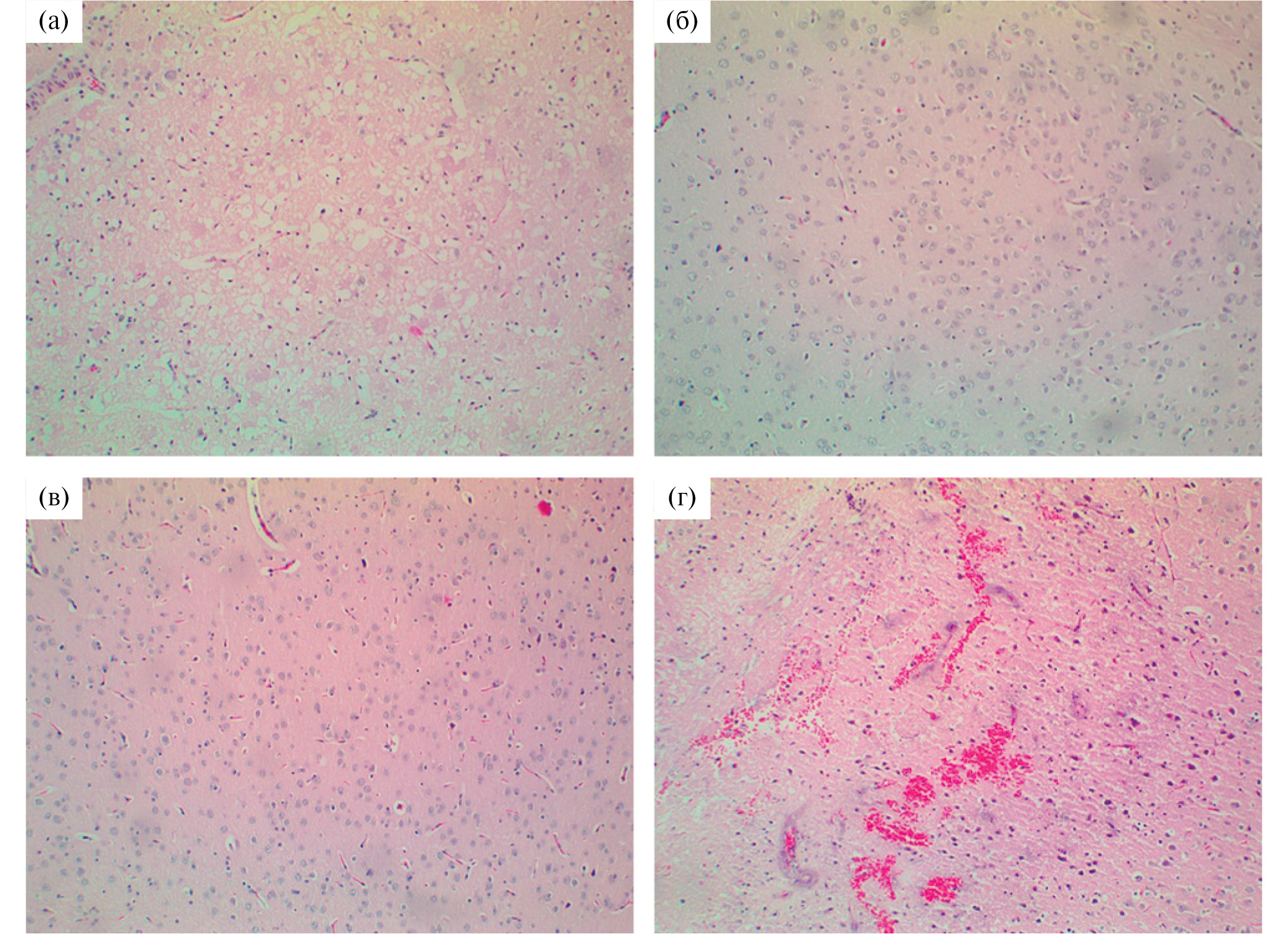 Fig. 2. Histological images of frontal brain slices, 24 hours after CAE. Hematoxylin and eosin staining. Magnification x100. (a) – ischemic stroke foci in an animal with CAE; (б) – brain of an animal with CAE and HOM therapy immediately after CAE; (в) – brain of an animal with CAE and HOM therapy one hour after CAE; (г) – hemorrhagic stroke foci in an animal with CAE and HOM therapy 2 hours after CAE.