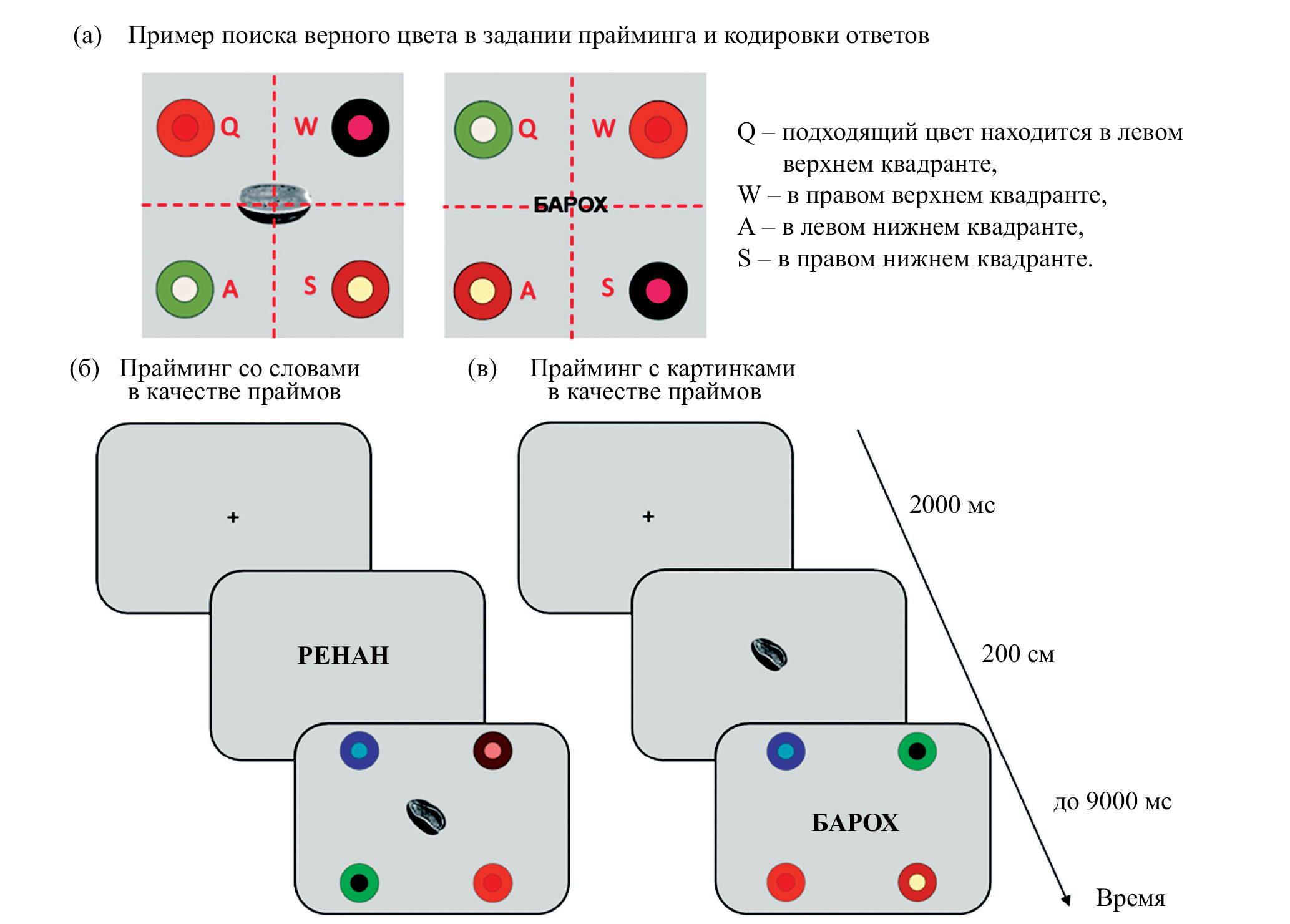 На этапе проверки использовался семантический прайминг с задачей цветового решения с параллельной записью глазодвигательной активности. В половине случаев целями являлись черно-белые изображения, которым предшествовали слова-праймы (или «неинформативные праймы», согласно заданным нами условиям), в другой половине – названия плодов, которым предшествовали черно-белые изображения-праймы («информативные праймы»). Участники исследования выполняли 64 задания каждого типа, предъявляемых в случайном порядке. Задача участника состояла в выборе соответствующей предъявляемому стимулу цветовой гаммы (выбор осуществлялся из четырех вариантов с помощью клавиш Q, W, A, S на клавиатуре компьютера). Цветовая гамма была представлена в виде двух цветных колец (внутреннее относилось к мякоти плода, внешнее – к кожуре). Временные параметры предъявления стимулов и варианты выбора ответа представлены на рис. 1.