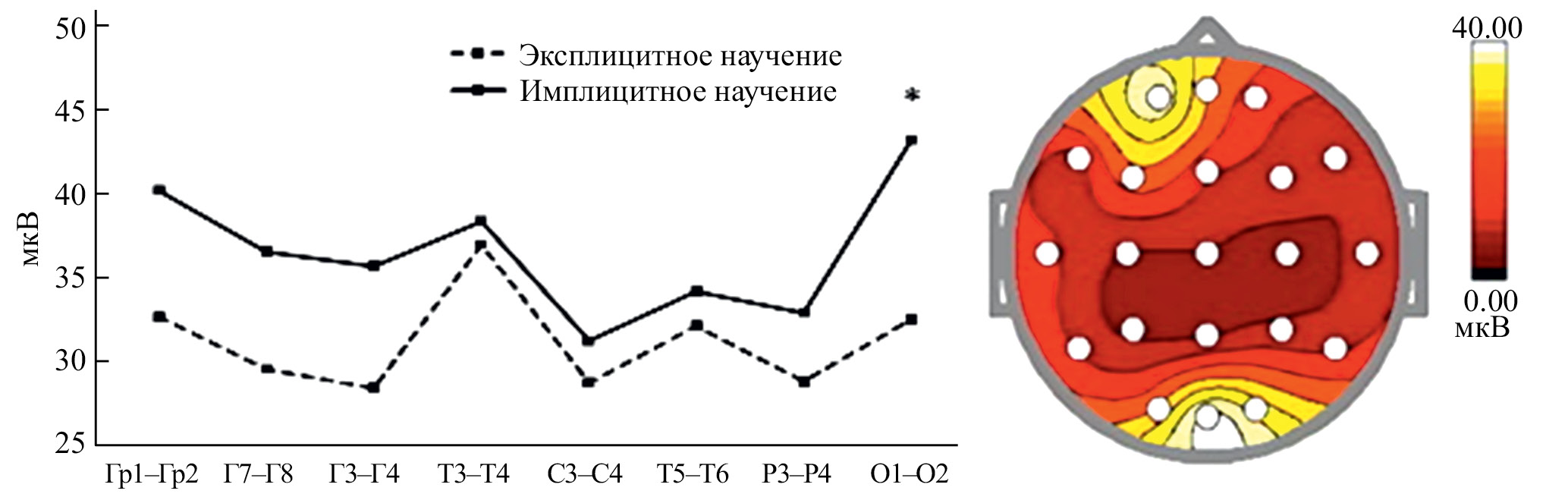Оценку параметров амплитуды ЭЭГ при имплицитном научении проводили в сравнении с традиционным статистическим (эксплицитным) научением, для чего использовали буквенные последовательности с очевидными закономерностями.