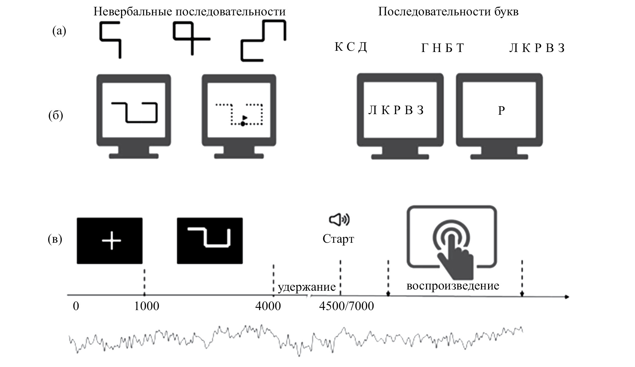 Стимулы. В качестве эталонных стимулов использовали два типа последовательностей: вербальные – наборы согласных букв длиной от 3 до 5 символов без повторов – и зрительно-пространственные – незамкнутые ломаные линии, составленные из отрезков, число которых менялось от 4 до 6. Примеры последовательностей показаны на рис. 1. Оба вида последовательностей предъявляли в двух режимах: статическом и динамическом. В статическом режиме вся последовательность предъявлялась целиком на фиксированное время 2000 мс. В случае вербальной последовательности это были строки букв, а в случае зрительно-пространственной – изображение целой ломаной линии. В динамическом режиме буквы предъявлялись одна за другой, слева направо, с временем экспозиции каждого элемента 500 мс, а ломаные линии – в виде движущейся по ломаной траектории точки, имитирующей графические движения человека, рисующего такую линию, с временем движения по каждому отрезку ломаной 500 мс. В качестве императивного сигнала к воспроизведению последовательности использовался короткий тональный звуковой сигнал.